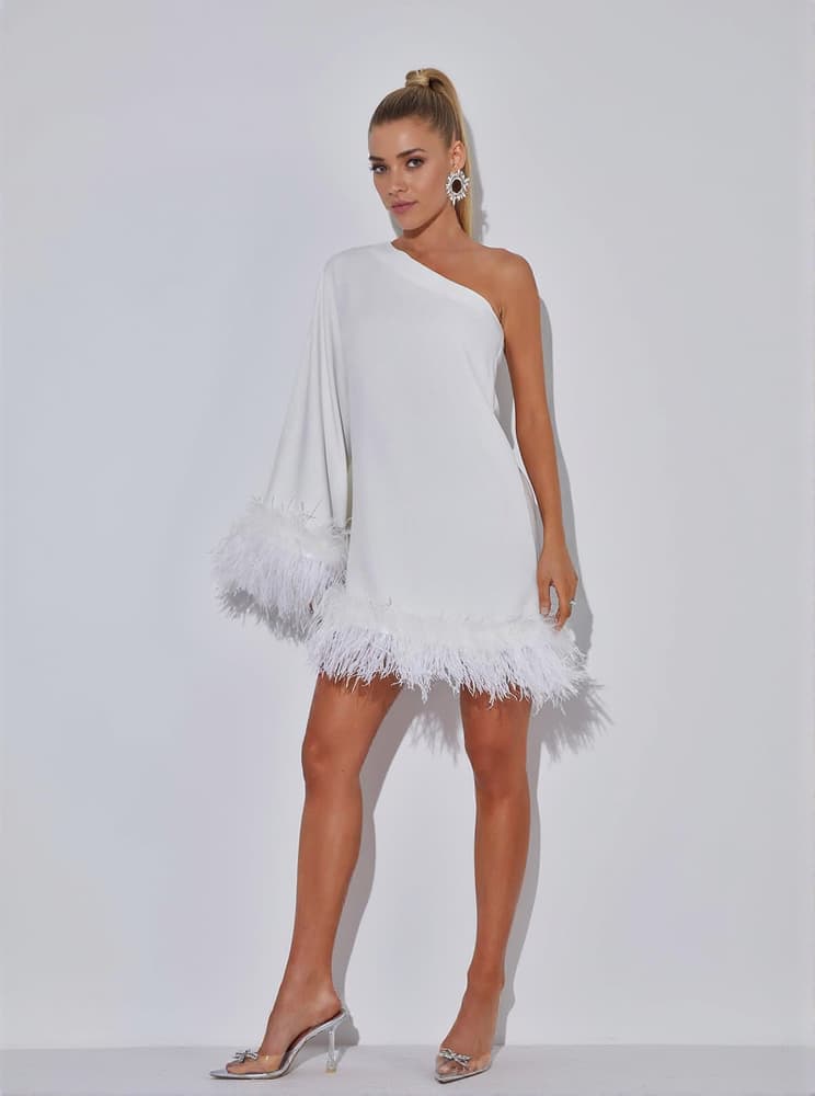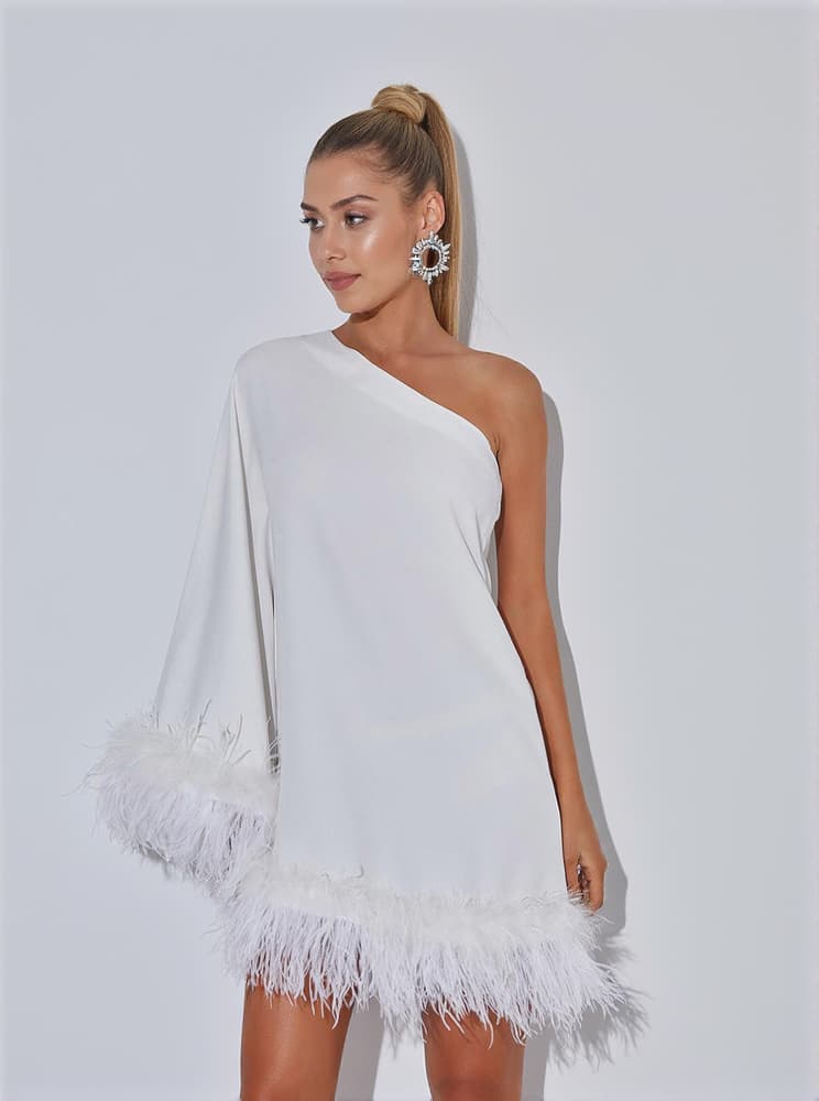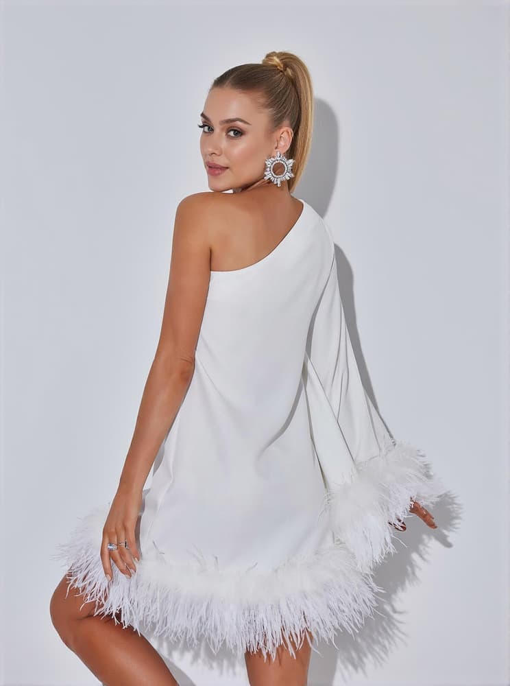 The Ceridwen One Shoulder Feather Mini Dress is a stunning statement piece. Featuring a unique one shoulder design and delicate feather trim, this dress is perfect for a special occasion and will turn heads. With a flattering mini length, this is sure to become your go-to piece for standout style.