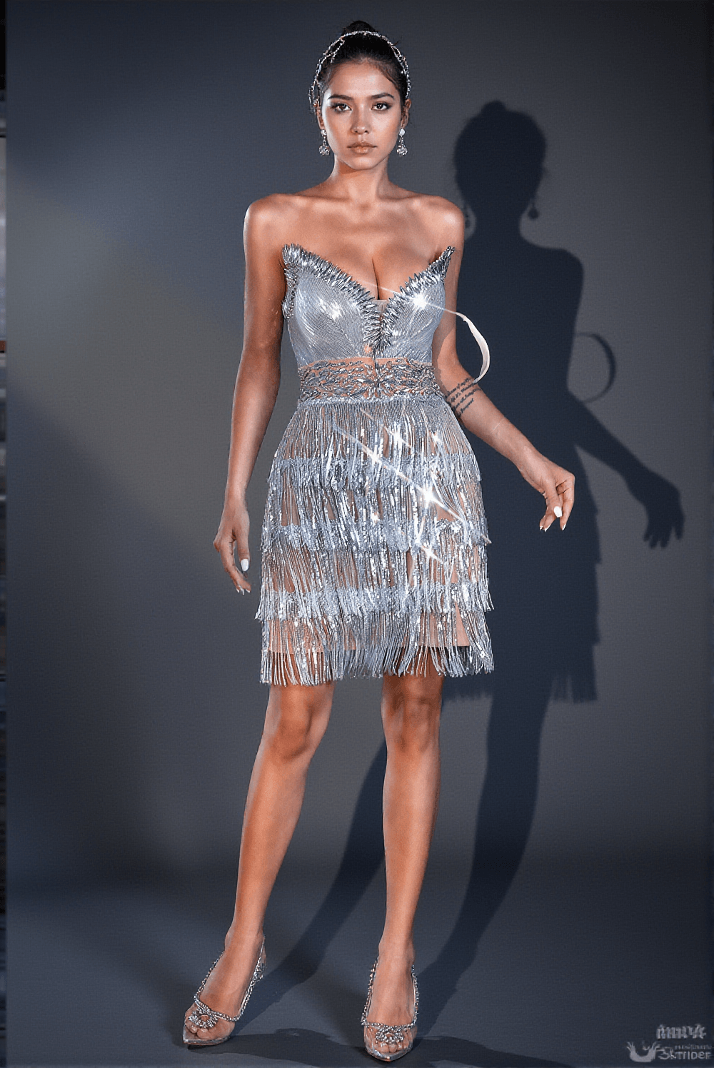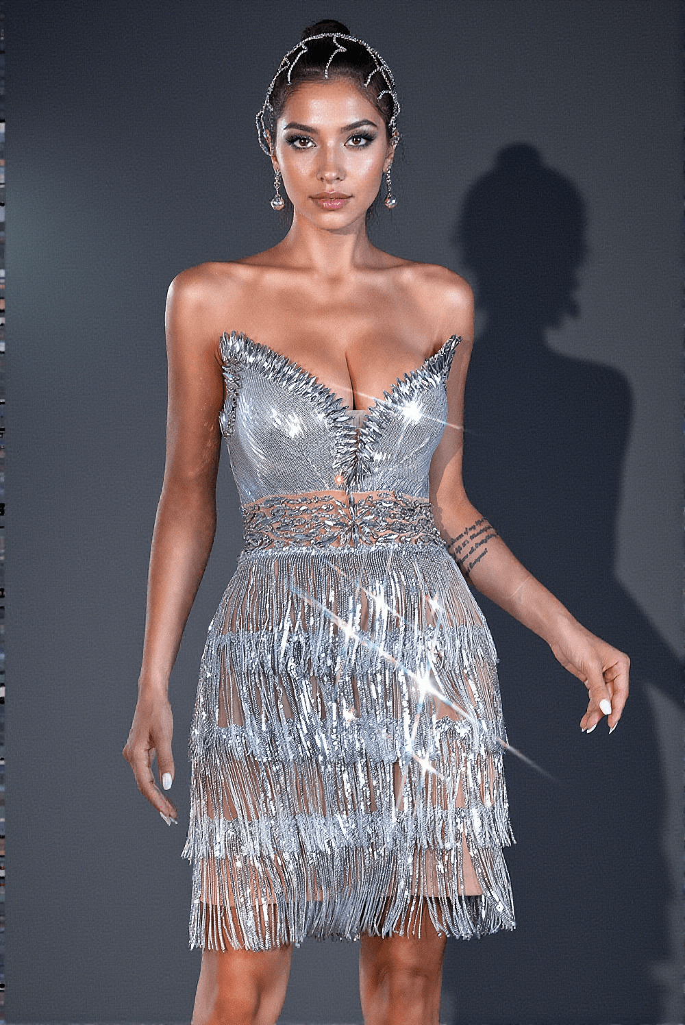 The Ceryn Dress is adorned with meticulous handmade diamond-fringed sequins that shimmer and glisten under the light. Each rhinestone is carefully placed to enhance your natural beauty and add a touch of elegance to every step you take.