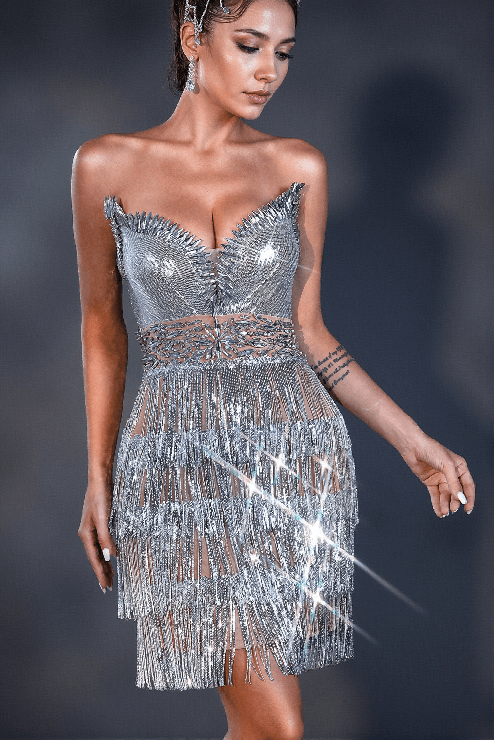 Step into the spotlight with our Ceryn Diamond Sequin Corset Dress, a masterpiece designed to captivate and dazzle at every upscale event. Crafted from a luxurious blend of 90% polyester fiber and 10% spandex, this dress hugs your curves perfectly while offering unparalleled comfort.