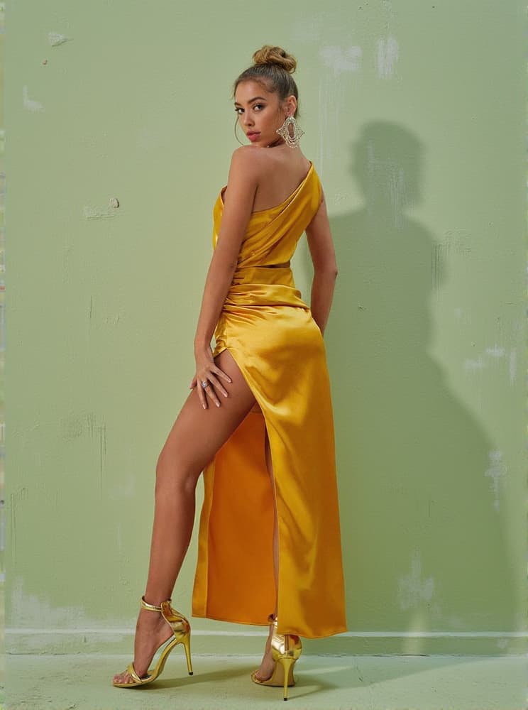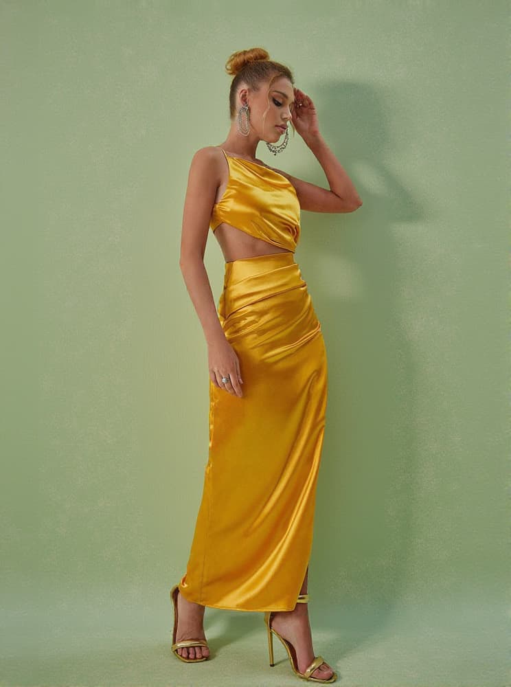 This Chara One Shoulder Cutout Maxi Dress In Gold features a split skirt and ruched detailing at the waist for added style and definition. The bold cutout showcases a modern silhouette, perfect for any special occasion. With gold-tone detailing and an elegant maxi length, this dress is sure to turn heads.