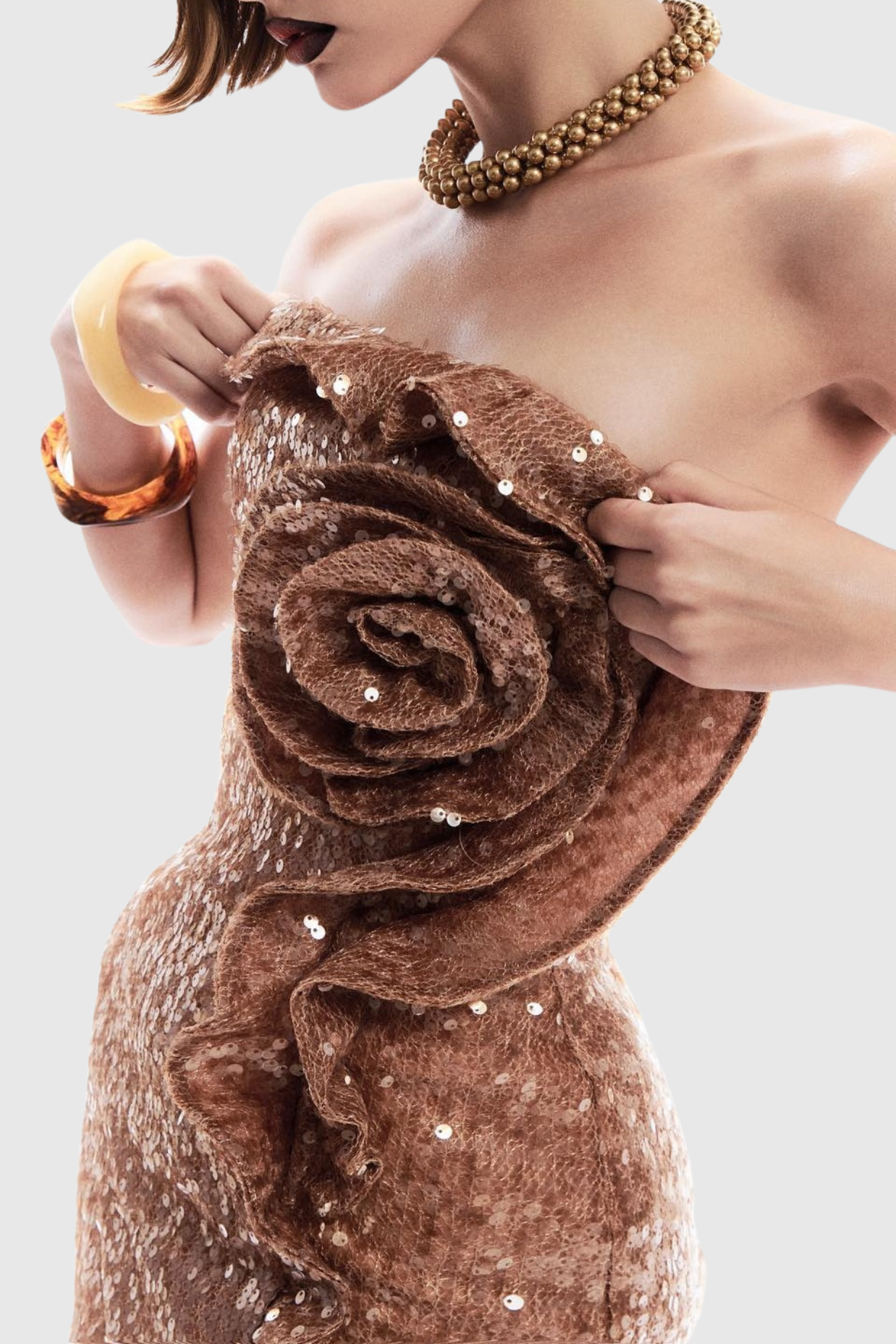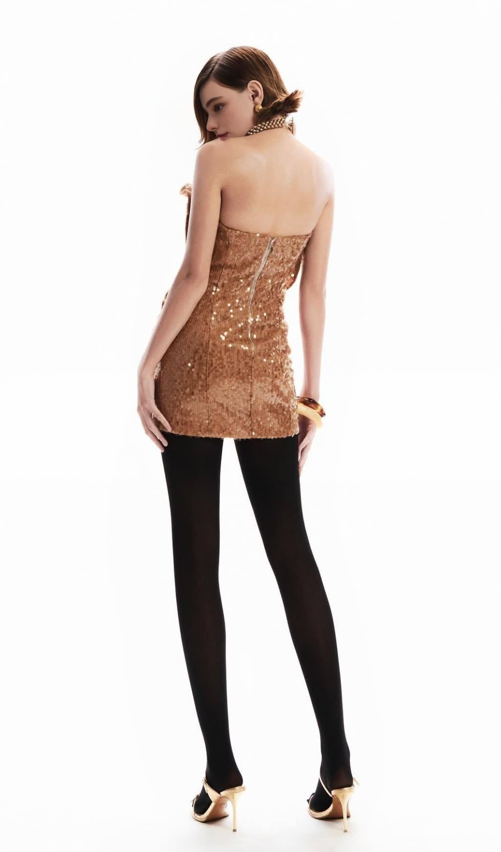 Charae Sequin Floral Strapless Mini Dress in brown