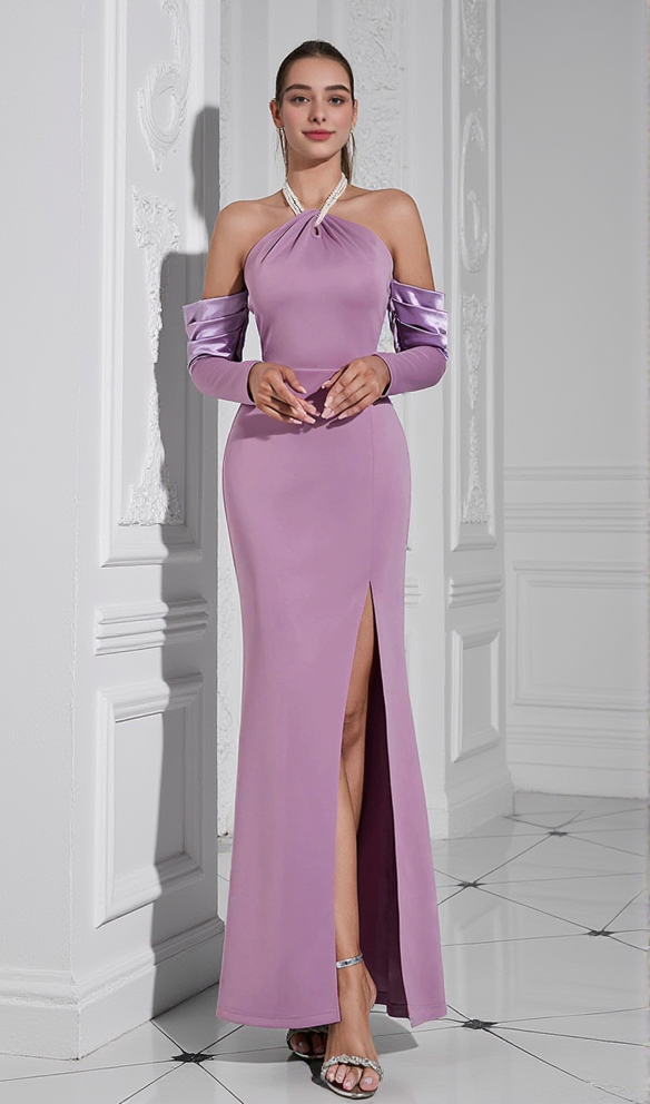 This elegant maxi dress combines an off-shoulder design and pearl halter neckline for a chic and sophisticated look. The rich purple color adds a touch of luxury, making it perfect for special occasions. Made with high-quality materials, it offers both style and comfort.