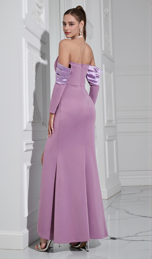 CHARLOTTE OFF-SHOULDER PEARL HALTER MAXI DRESS IN PURPLE
