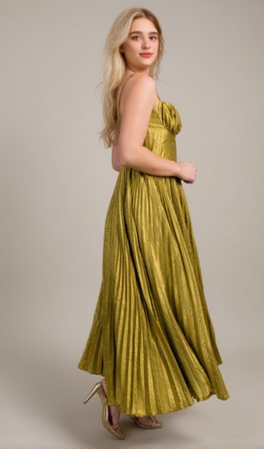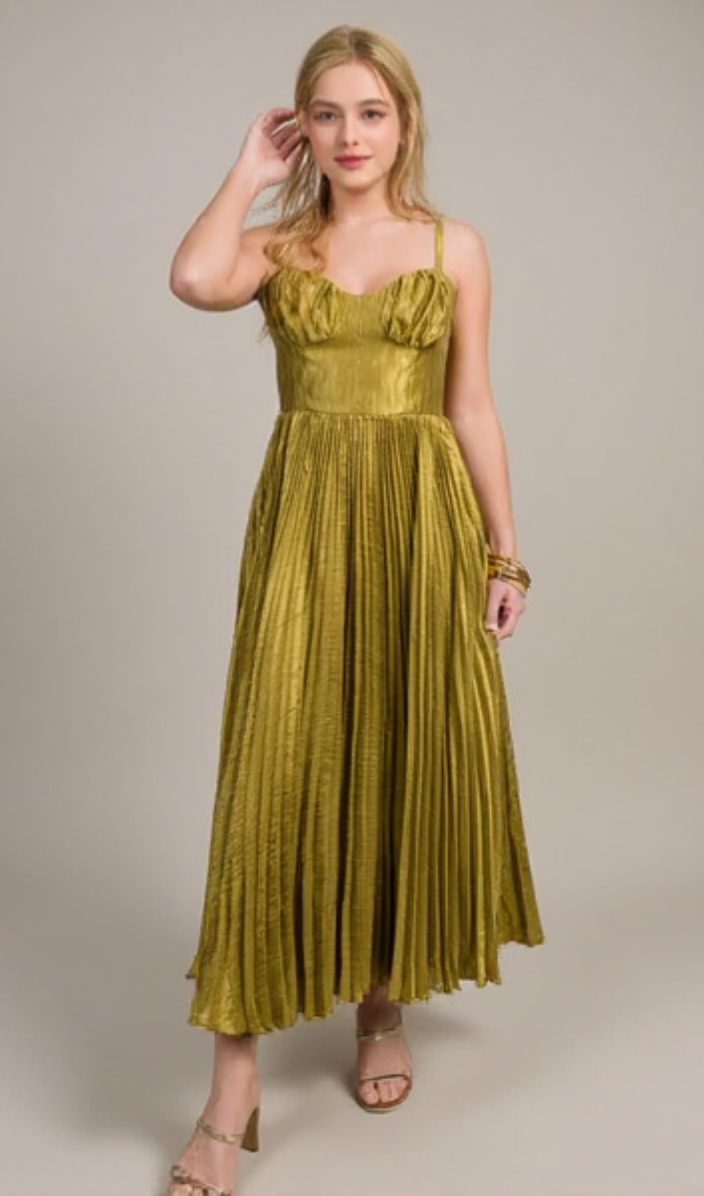 This midi is a stunning wedding guest dress option! The shimmery fabric has a subtle crinkle texture. Midi features a flirty bustier style bodice, and the flowy pleated skirt creates a twirl-worthy look.
