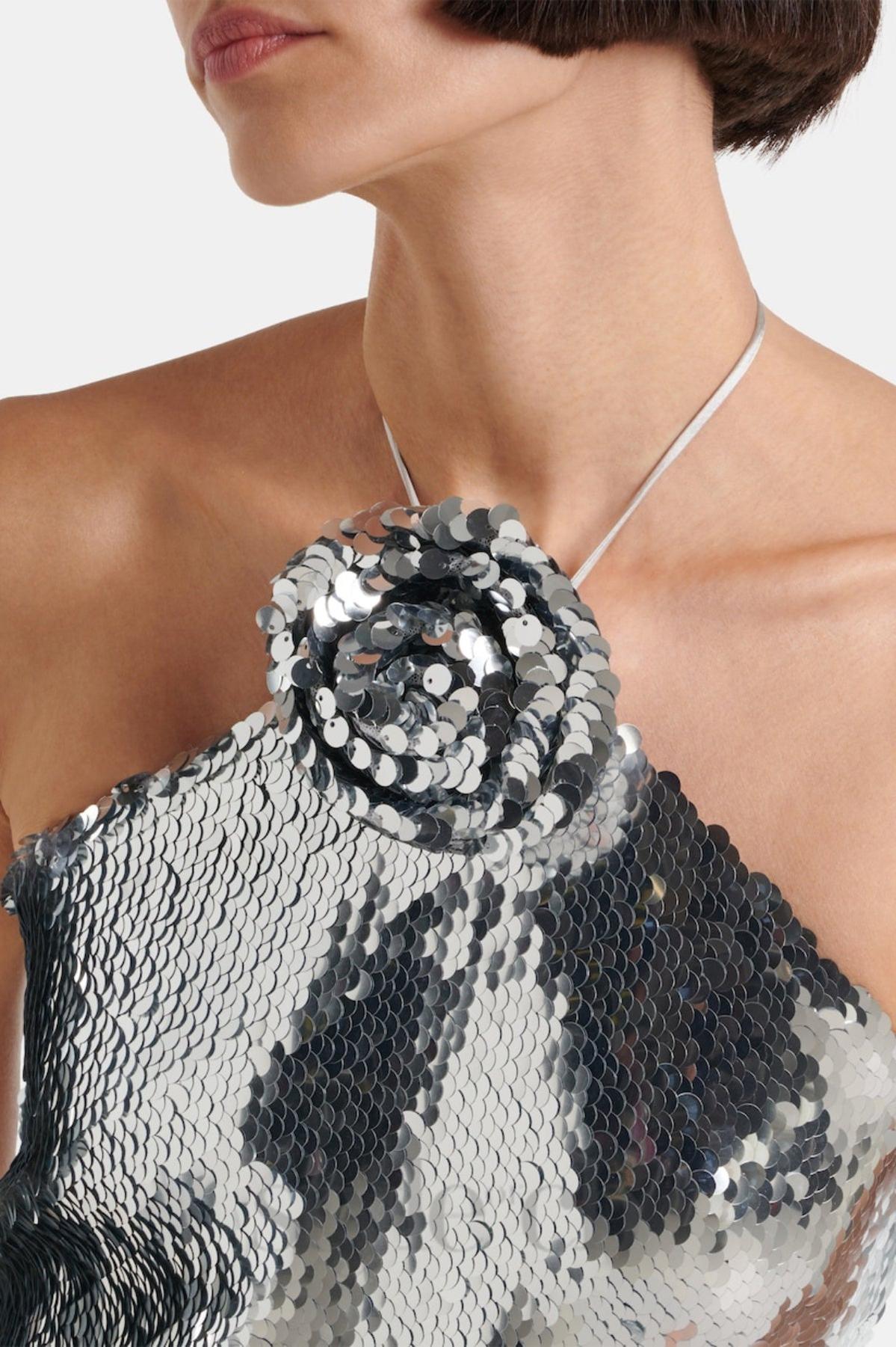 Cinwa Floral Appliqué Halter Sequin Mini Dress - Silver