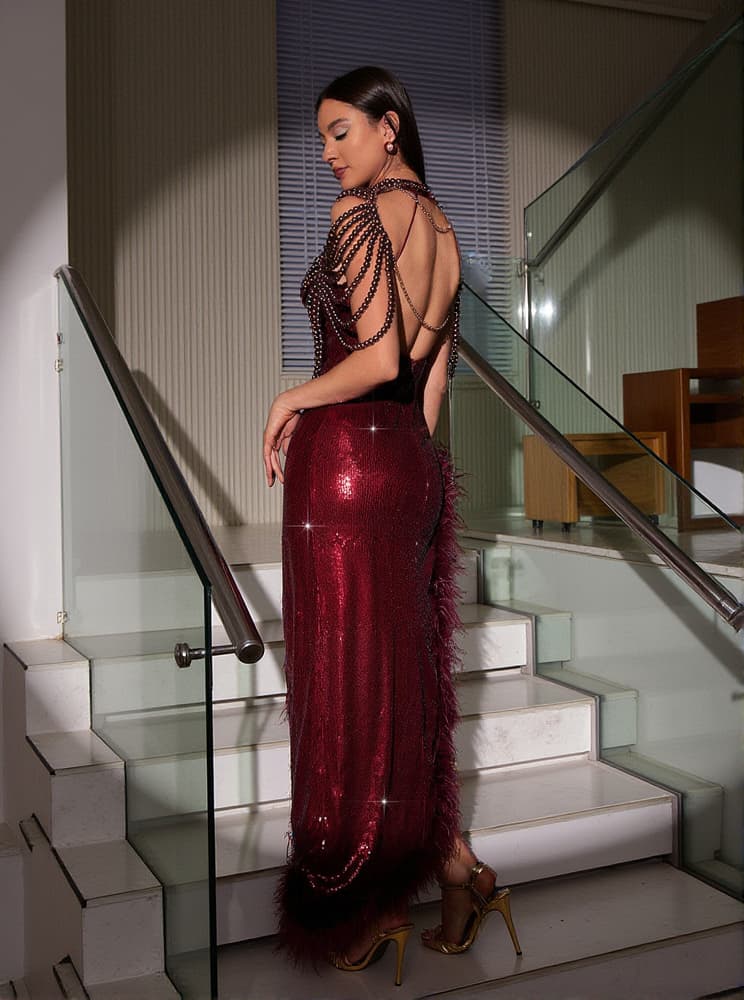 Introducing the Cole Sleeveless Feather Sequin Dress In Wine, featuring a beautiful combination of sequin and feather fabrics crafted for a classic look. Perfect for showing off your style and creating a sophisticated, chic look. Perfect for special events and occasions.