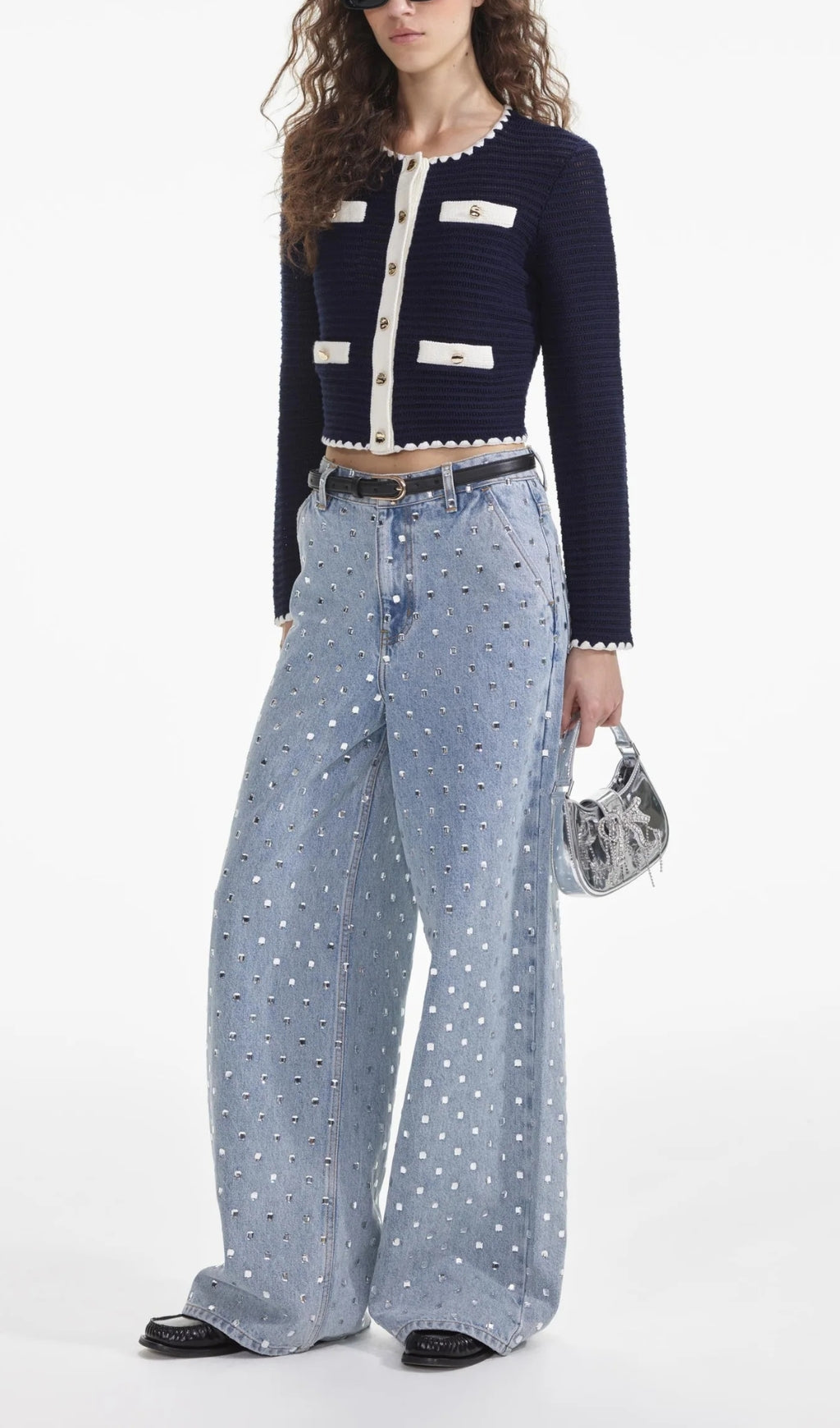 NAVY CROCHET CONTRAST TRIM CARDIGAN