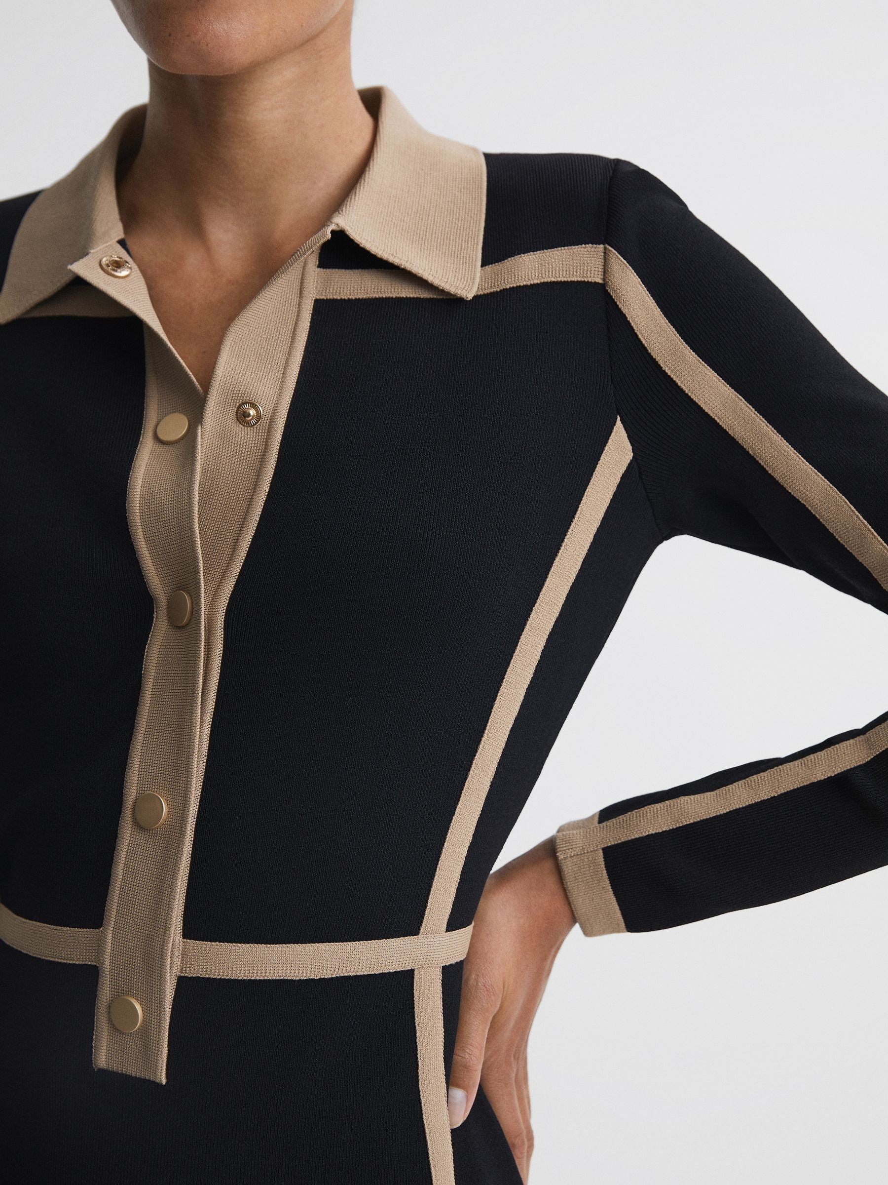 Contrast Trim Press-Stud Mini Dress in Black/Camel