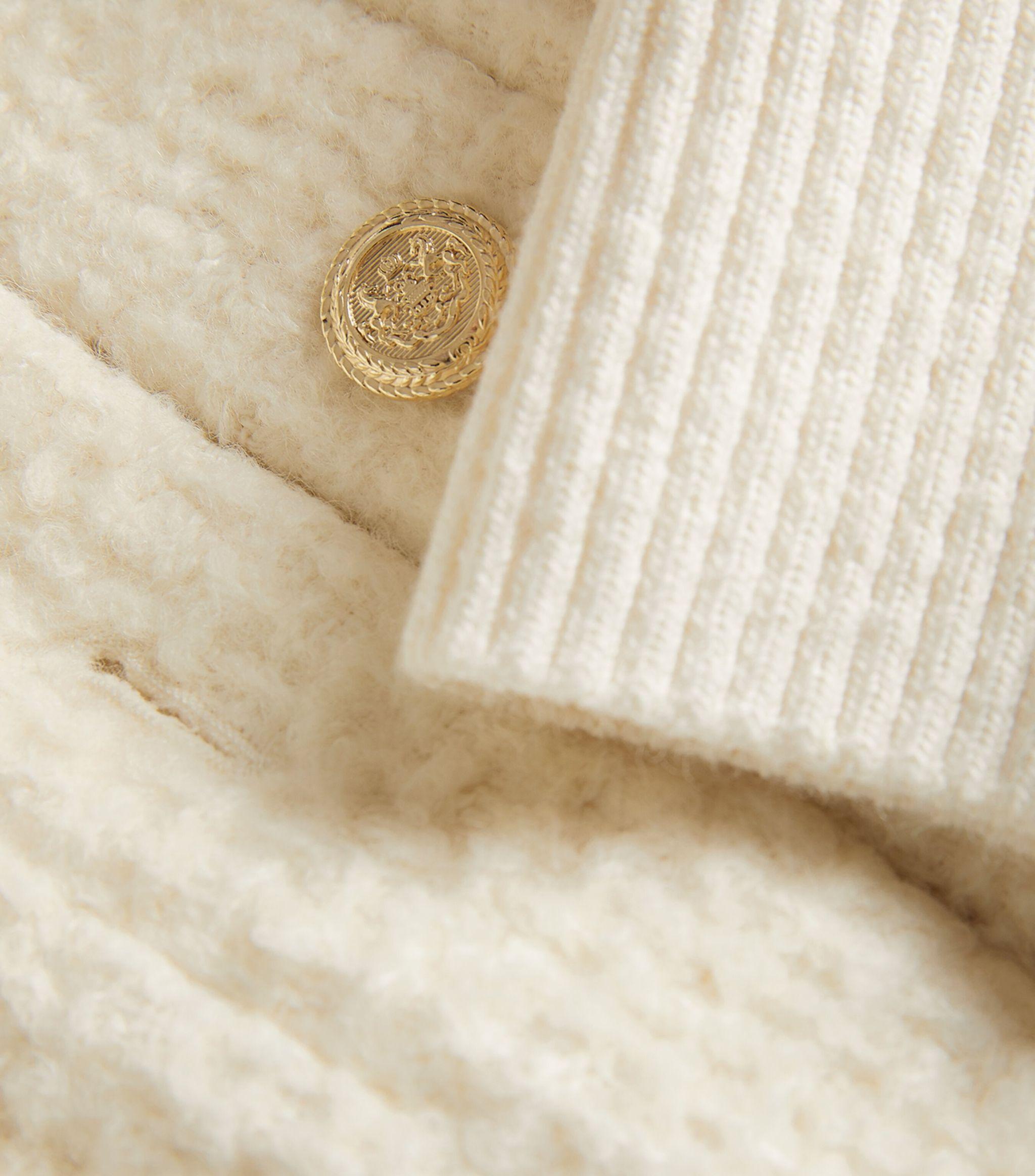 • Main fabric: 31% wool/27% acrylic/27% cotton/11% polyester/4% viscose; lining: 100% viscose; rib: 78% acrylic/17% polyester/4% nylon/1% elastane; braid: 85% polyester/15% metallic fibers; collar lining: 100% cotton