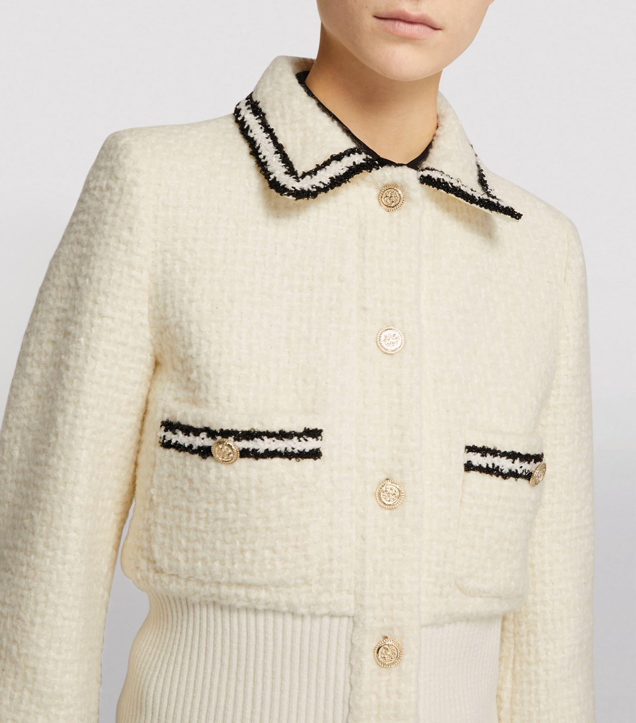 This jacket features a unique contrast-trim design that adds an unexpected twist to a classic tweed style. With a playful tone, this jacket is perfect for those who love to have fun with their fashion.