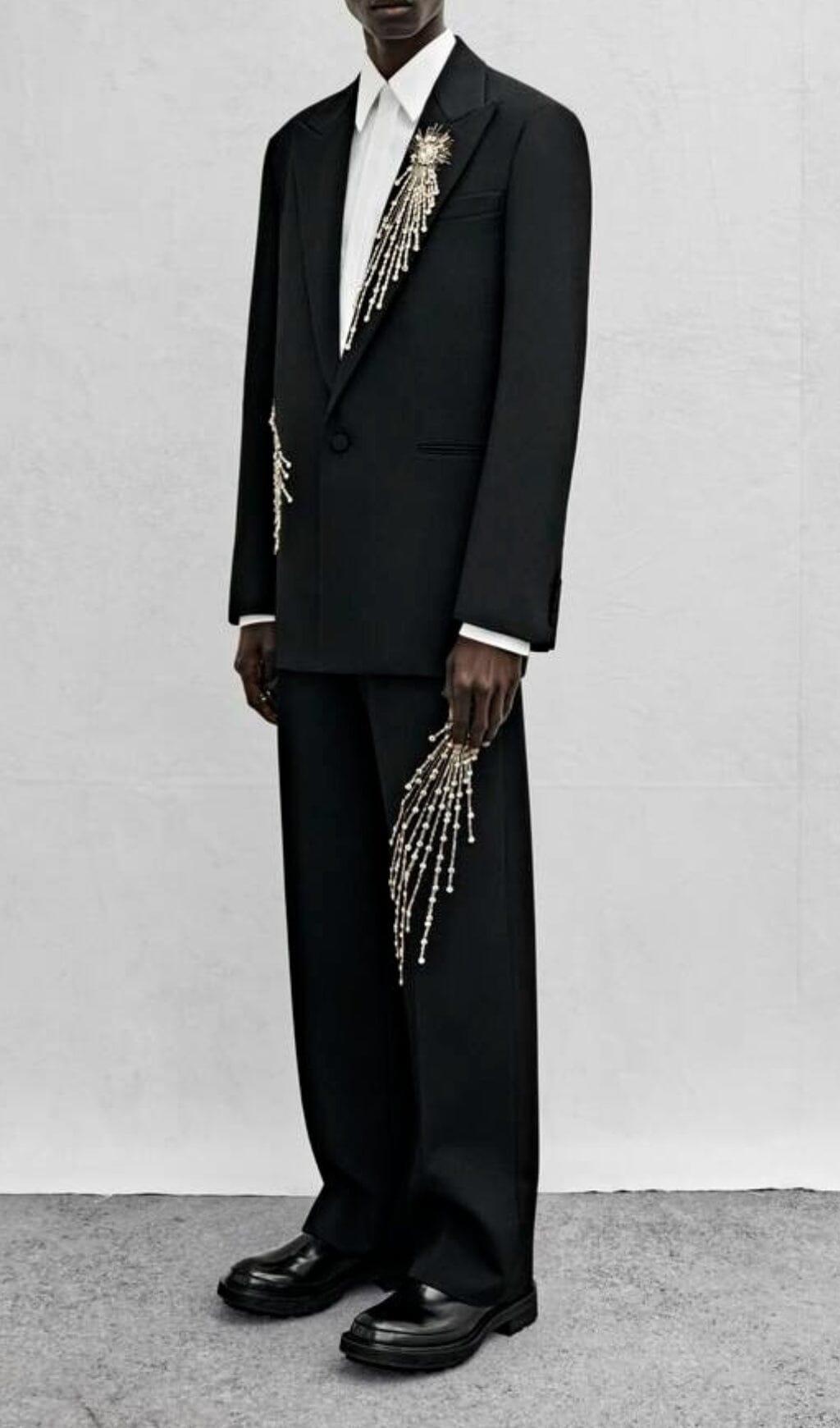 • Sparkling crystals: The peak lapel is adorned with sparkling crystals, adding a touch of glamour to the suit set.