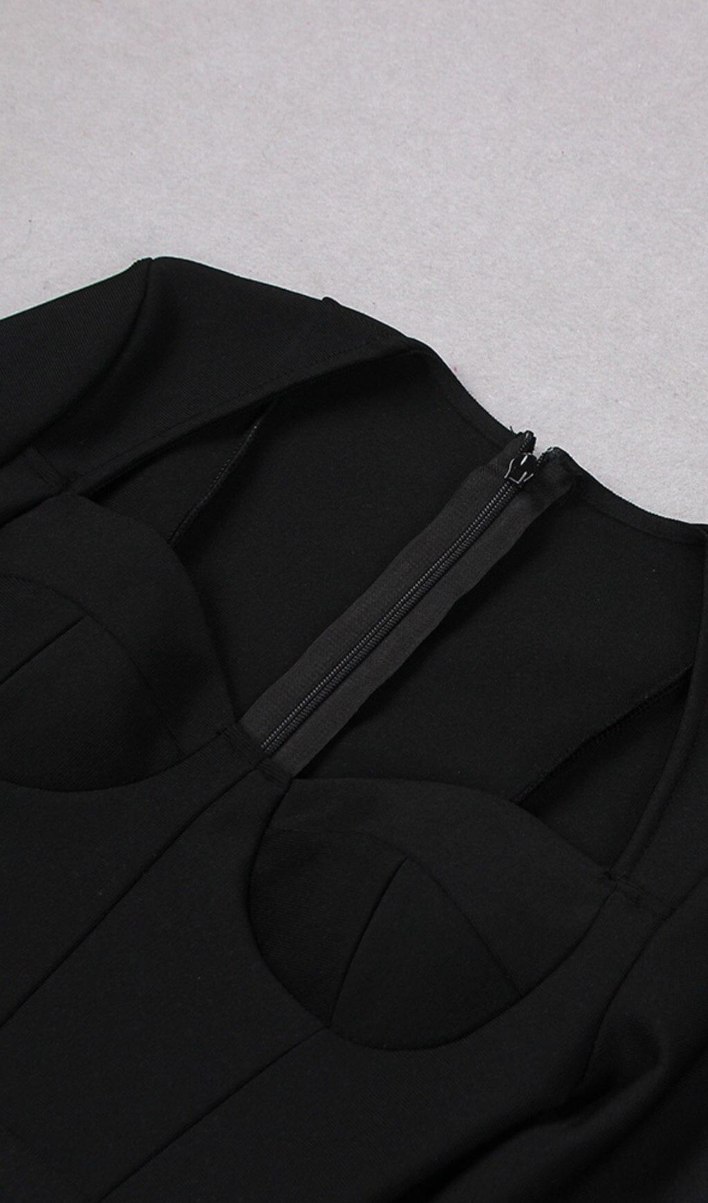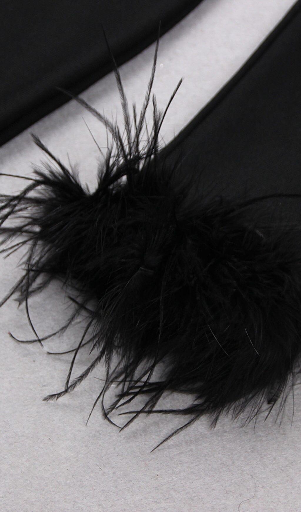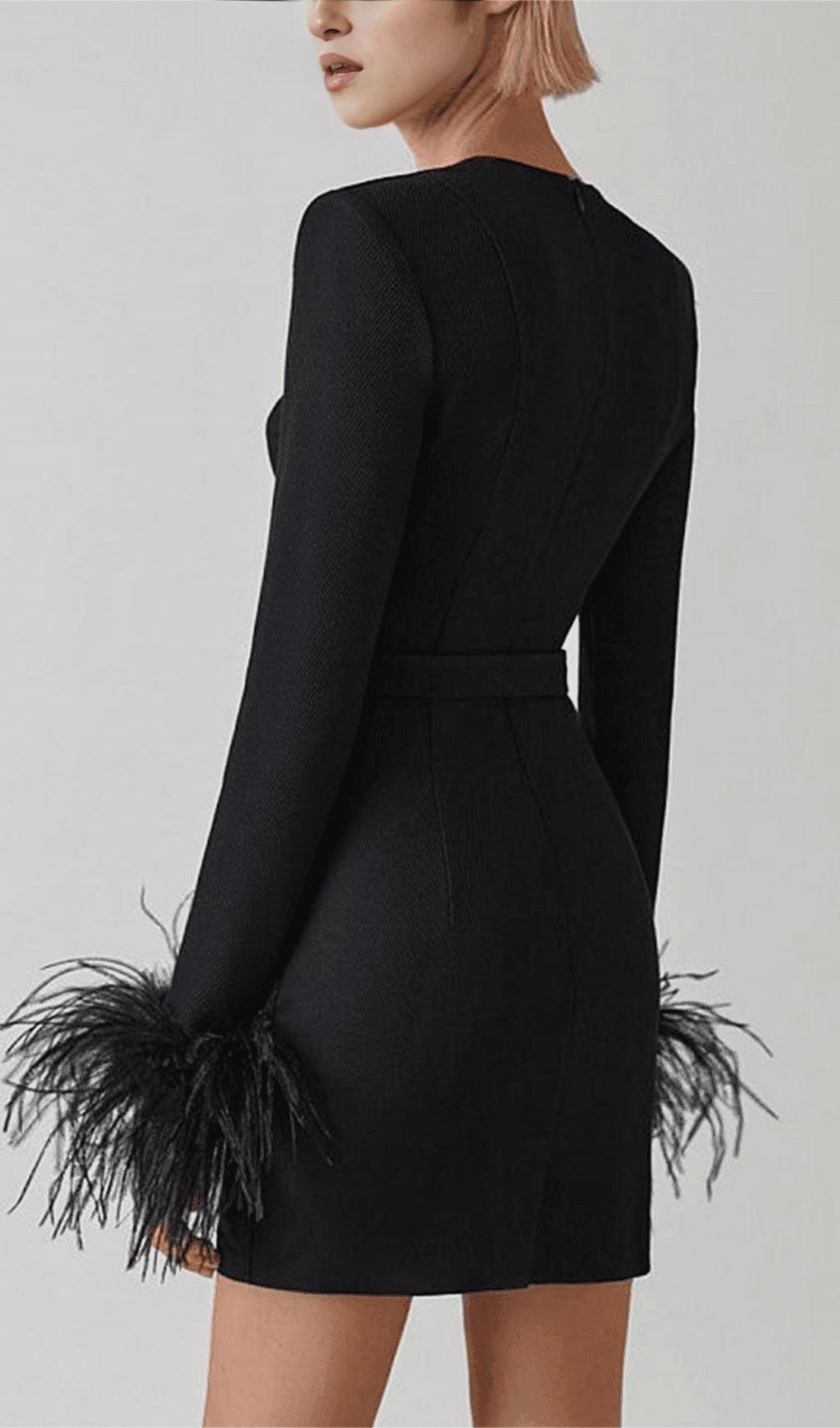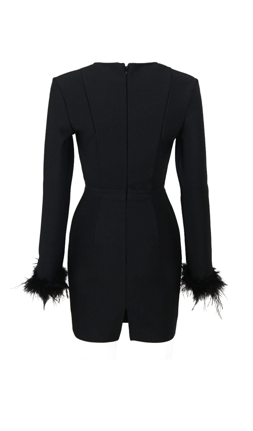 STRETCH LONG SLEEVES FEATHER MINI DRESS IN BLACK