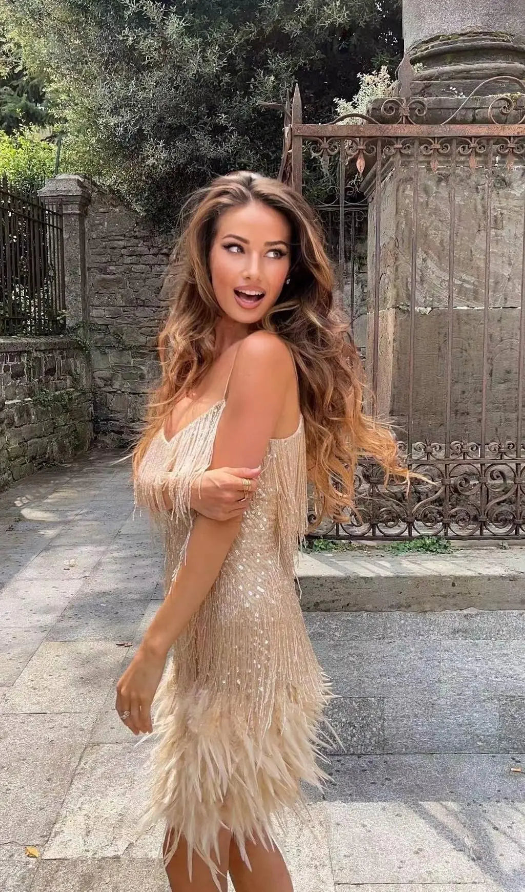TASSEL FEATHER MINI DRESS IN BEIGE