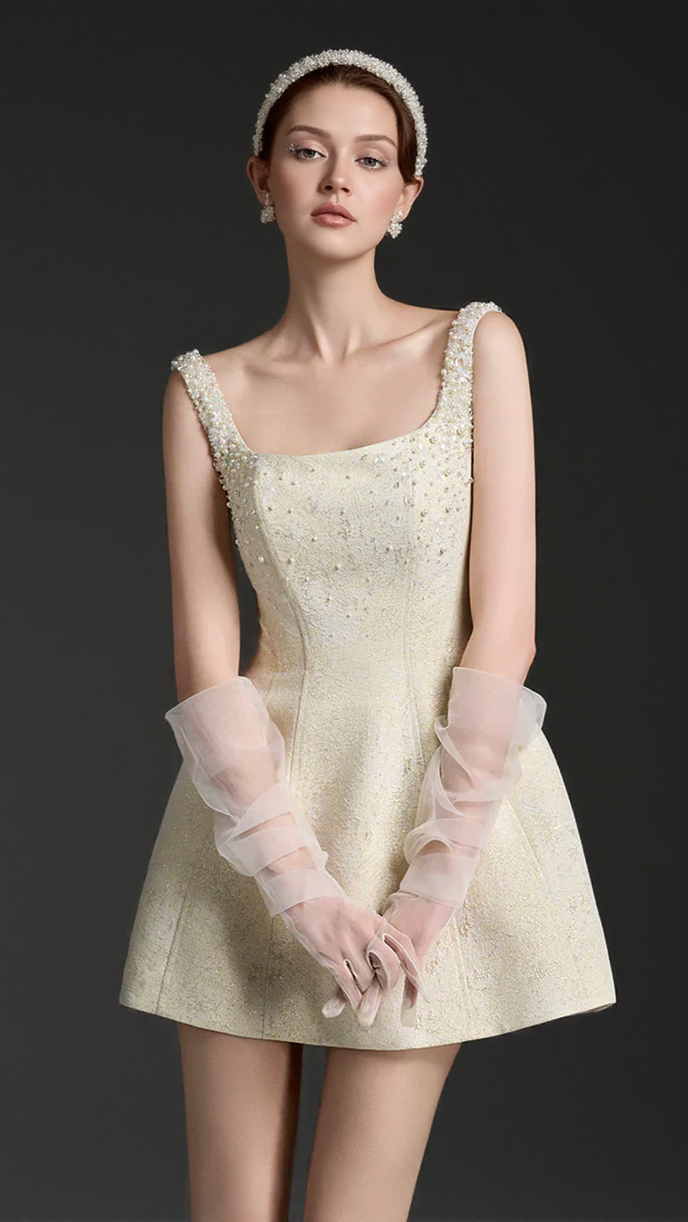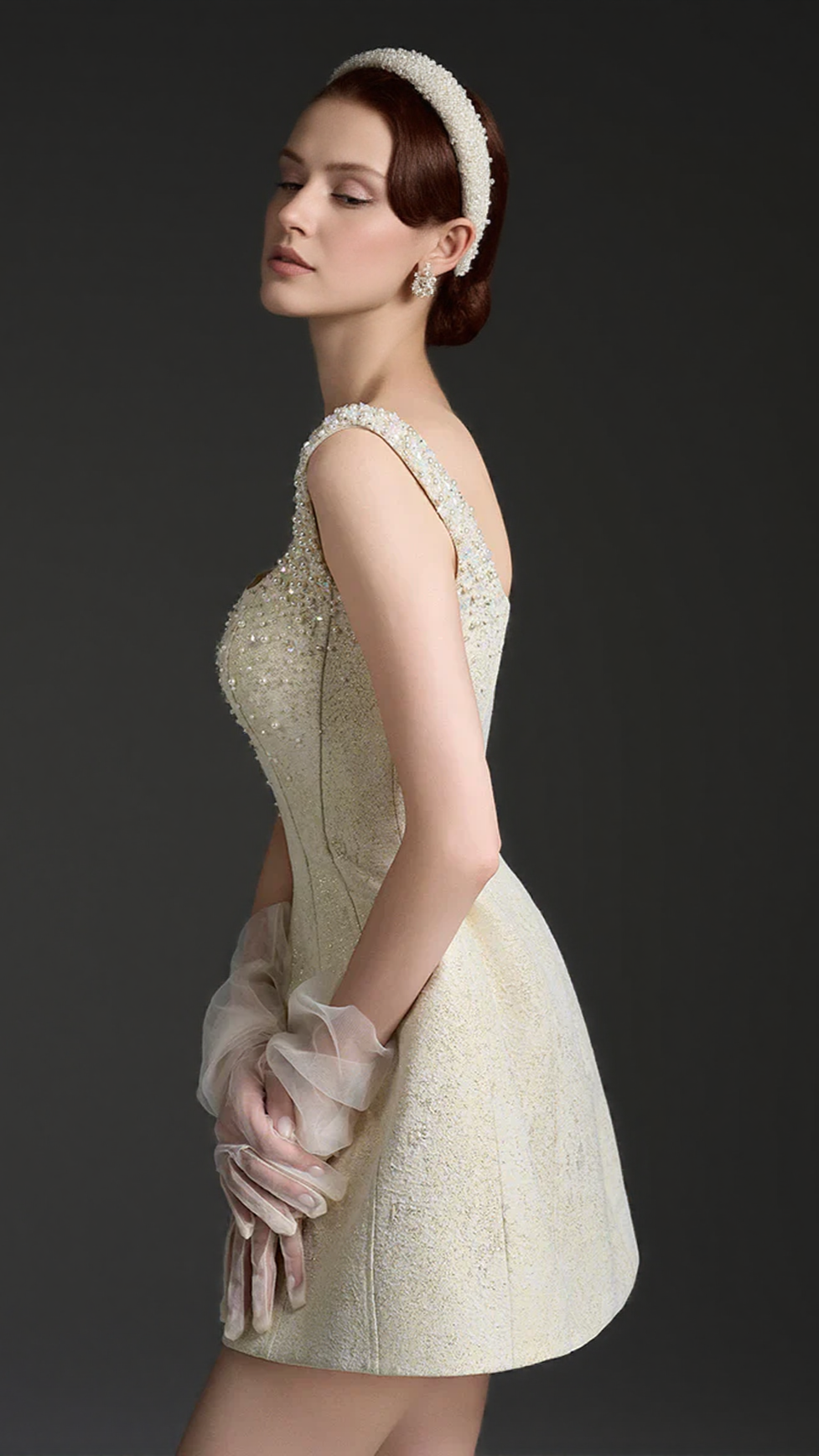 CORA LIGHT YELLOW SILK LINED LACQUERED BROCADE MINI DRESS