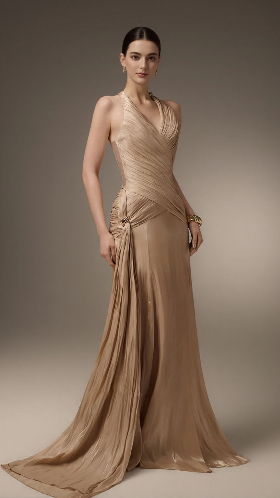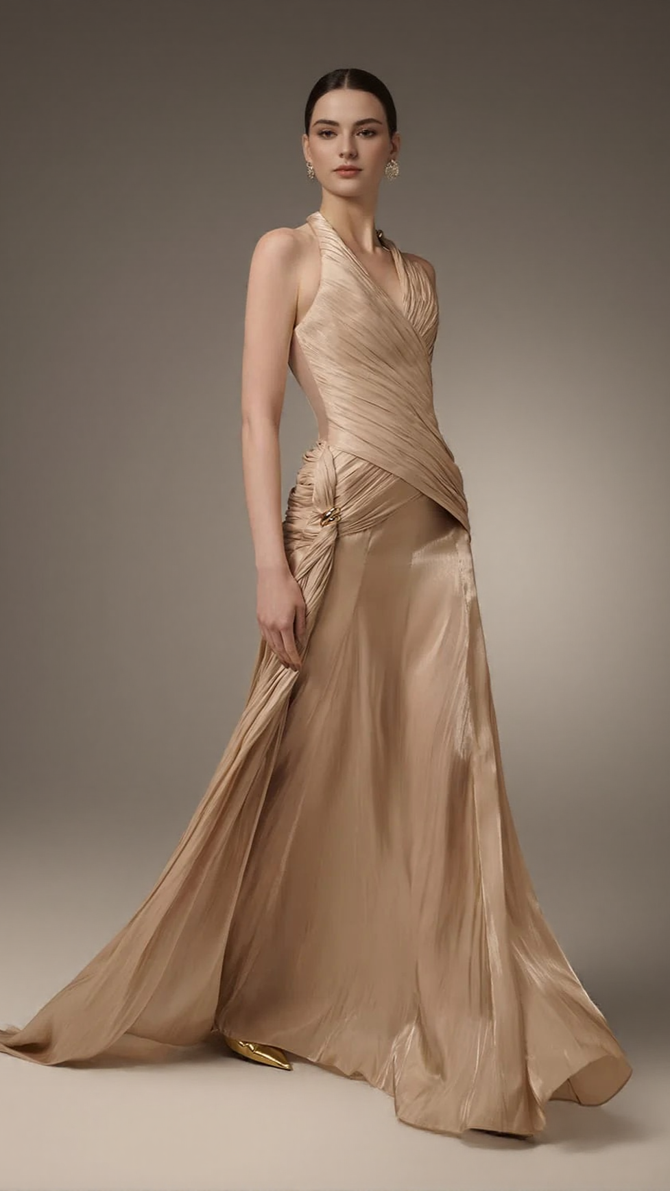 This floor-length dress features a sophisticated corset waist design crafted from a luxurious silk blend, ensuring both comfort and structure. The halter neckline highlights the shoulders gracefully, while the champagne color adds a timeless, elegant touch suitable for formal occasions. Perfectly tailored to enhance silhouette and movement, this dress combines classic refinement with modern style.