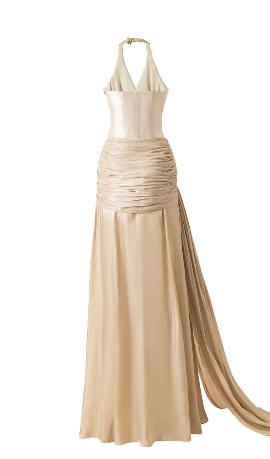 CORSET WAIST SILK BLEND HALTER FLOOR LENGTH DRESS IN CHAMPAGNE