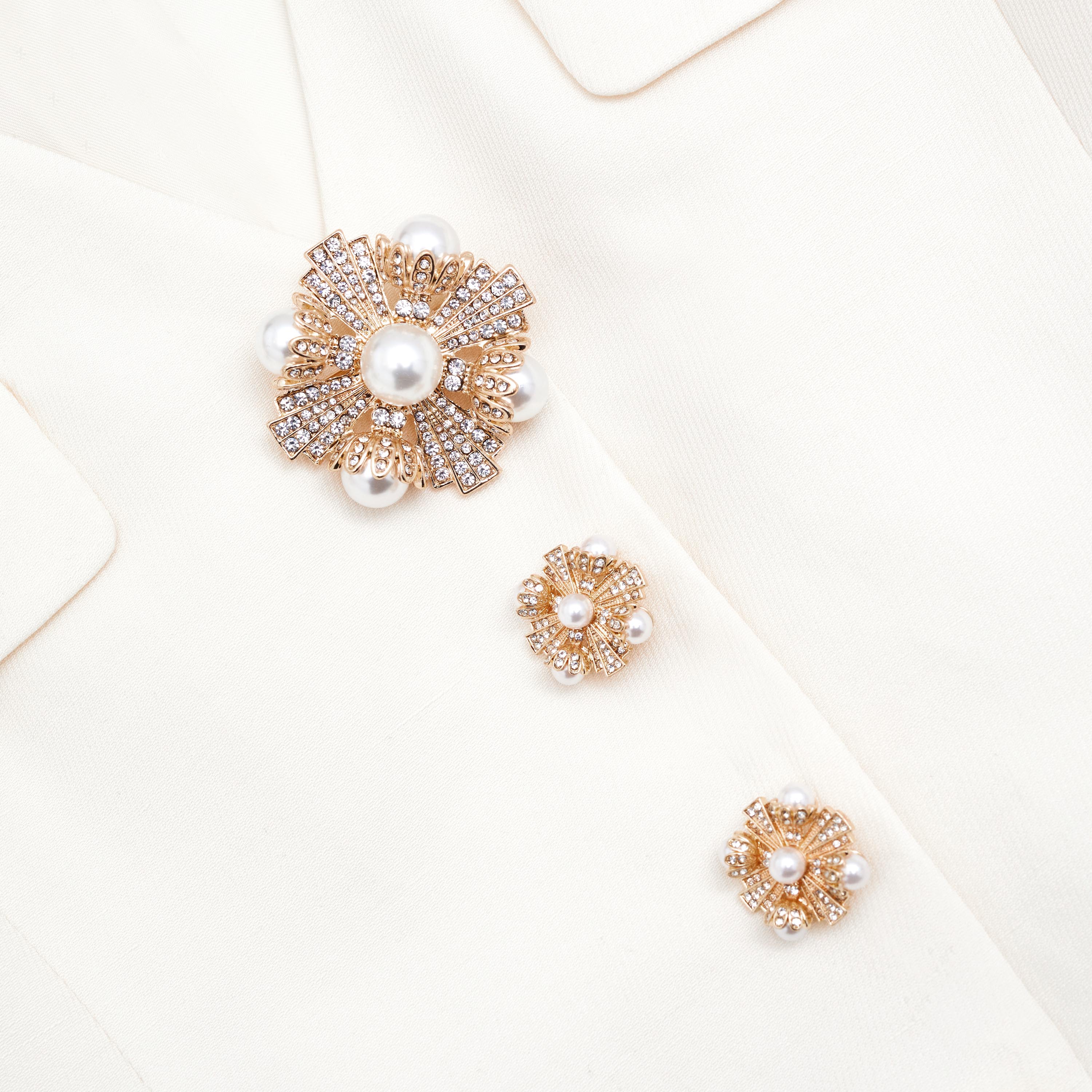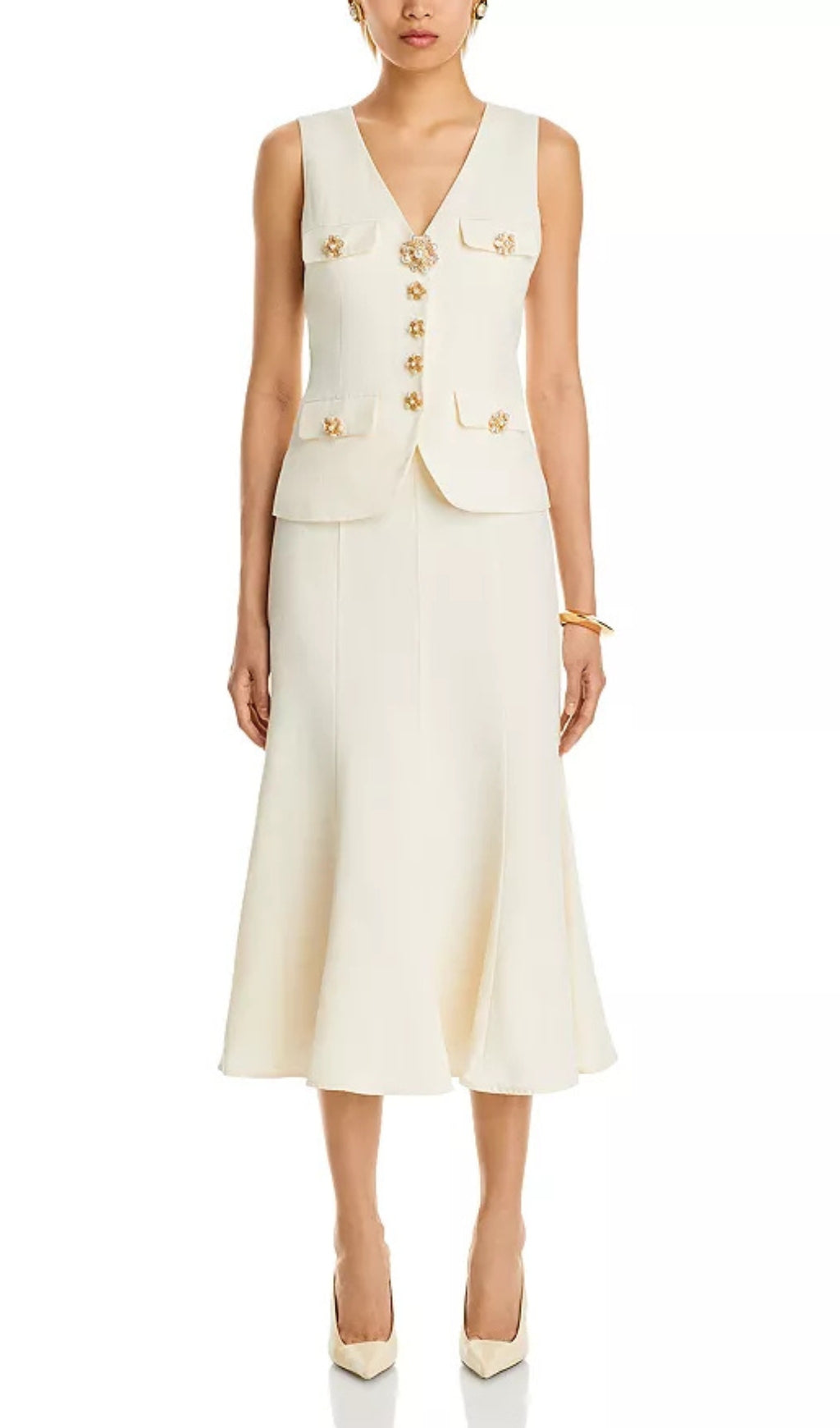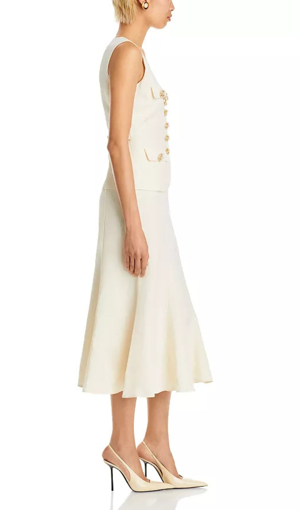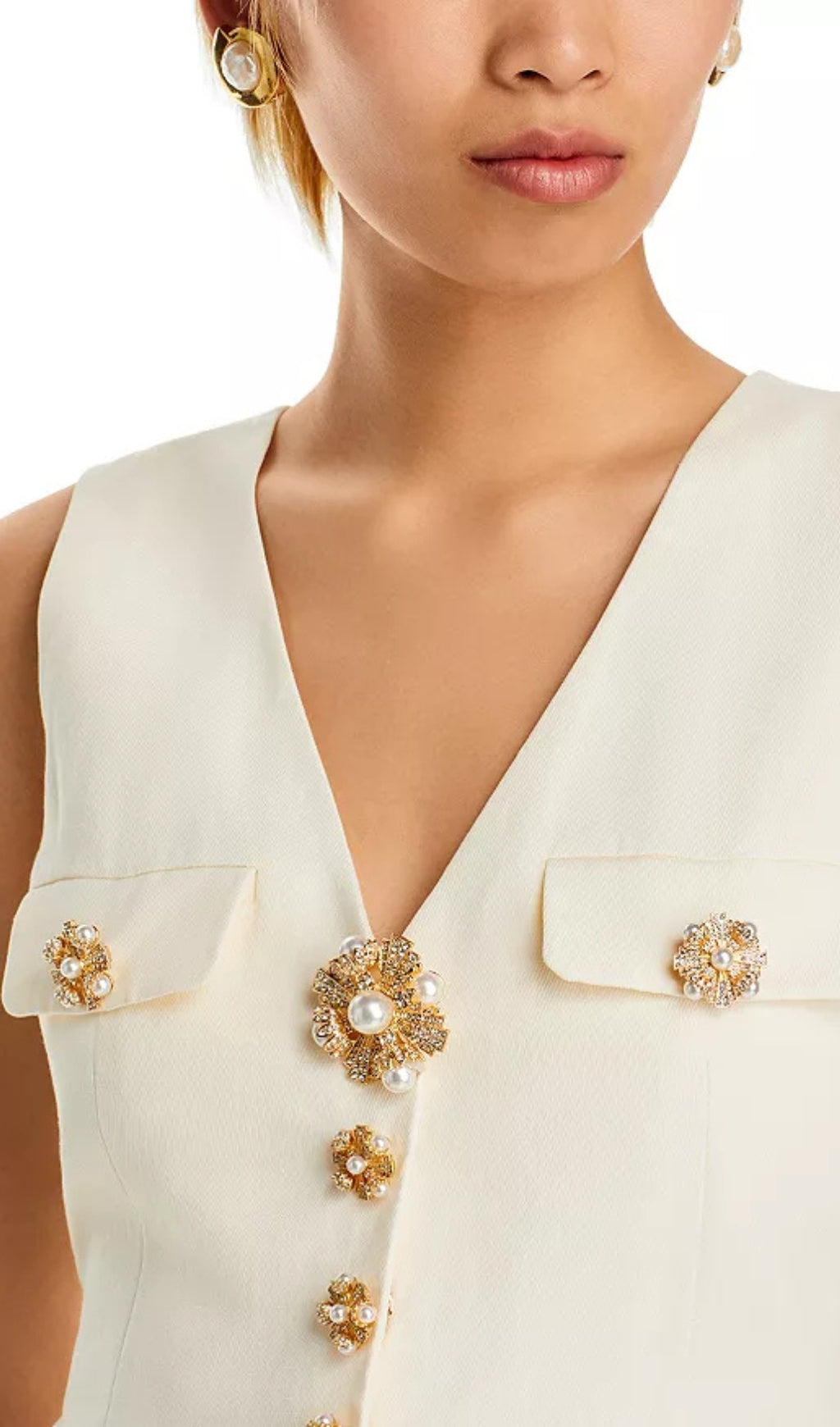 Life's a breeze in this cream linen midi which falls to an elegant midi length. Gold, pearl & diamanté buttons and brooches elevate the timeless silhouette. Ideal for desk to dinner dressing.