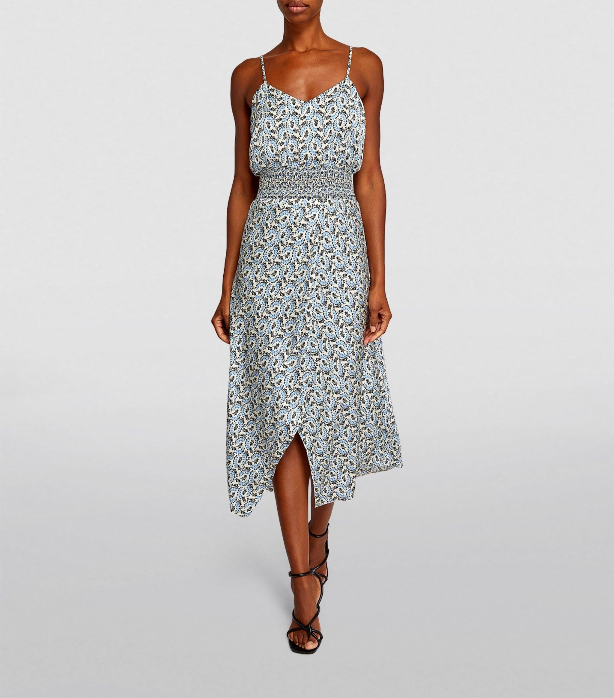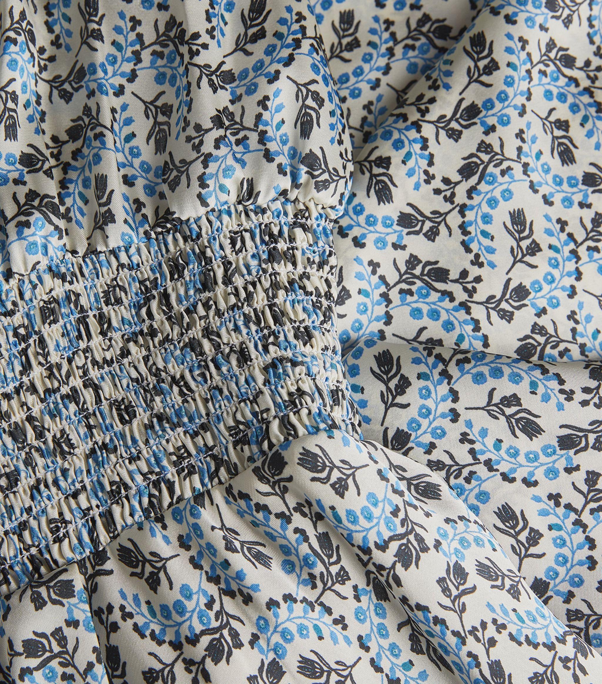 • Skirt: smocked waistband, midi silhouette, center front slit, Lily of the Valley print, satin fabrication