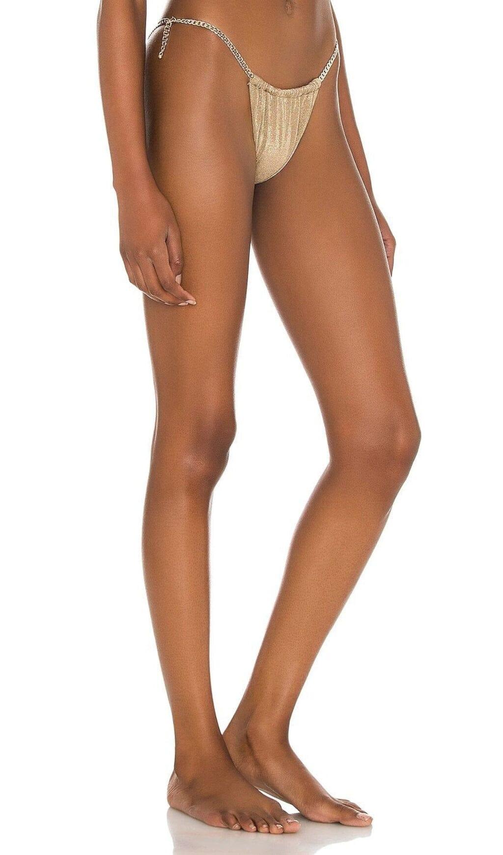 Featuring criss-cross straps that flow through ruched channels, this bikini suit allows you to customize the level of reveal to your preference. Whether you want a more modest look or a daring one, the Cross Strap Chain Bikini Suit has got you covered.