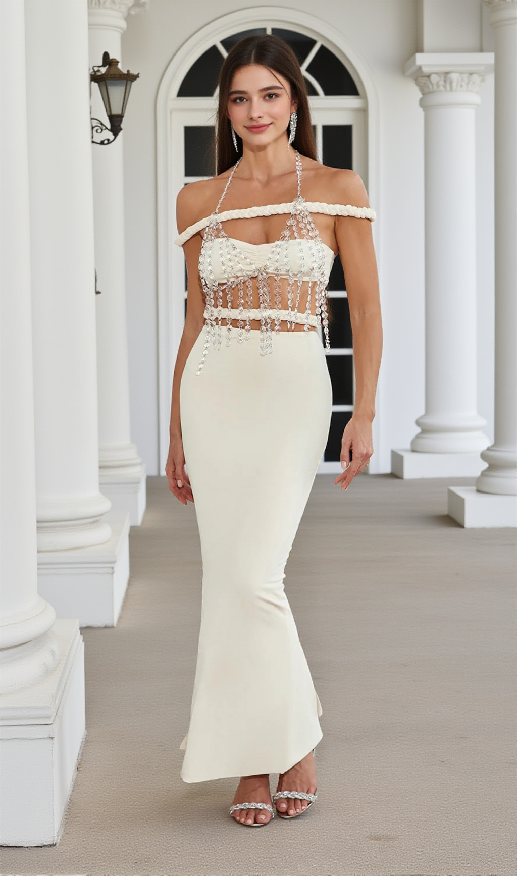 Expertly crafted with delicate crystal chain embellishments, this apricot fishtail skirt set is the epitome of elegance and luxury. The sparkling chains add a touch of glamour to the figure-hugging silhouette, making it perfect for special occasions or a night out on the town. Let this stunning set elevate your wardrobe and make you feel like a true fashion expert.