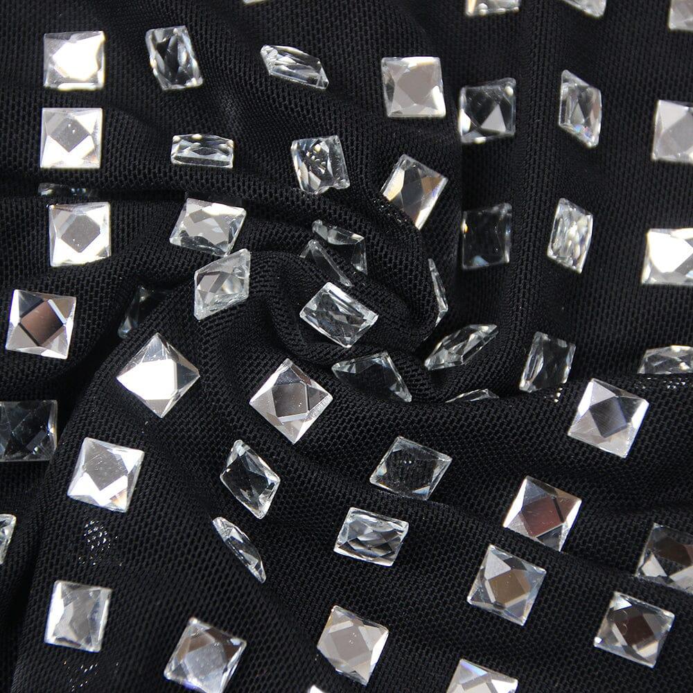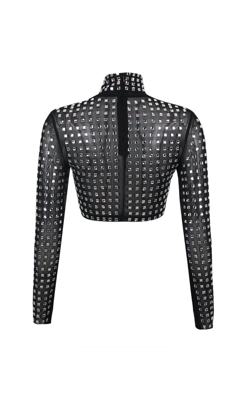 What sets this crop top apart is its unique and eye-catching crystal-encrusted neckline. It adds a touch of glamour and sophistication to any outfit, making you stand out from the crowd. The cropped length and fitted silhouette create a sleek and modern look, perfect for pairing with high-waisted jeans, skirts, or shorts.