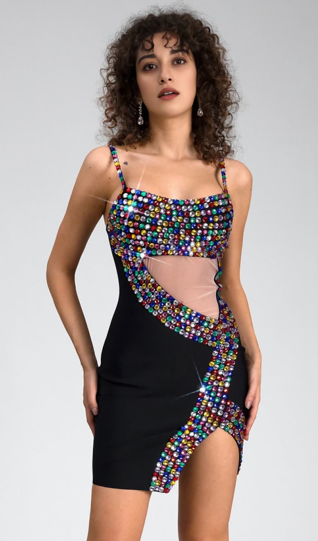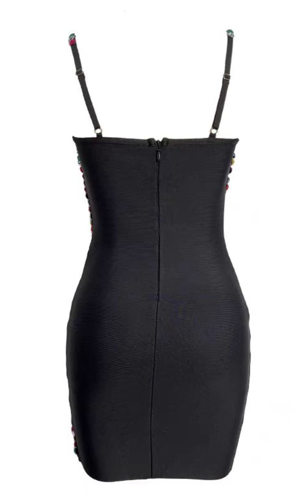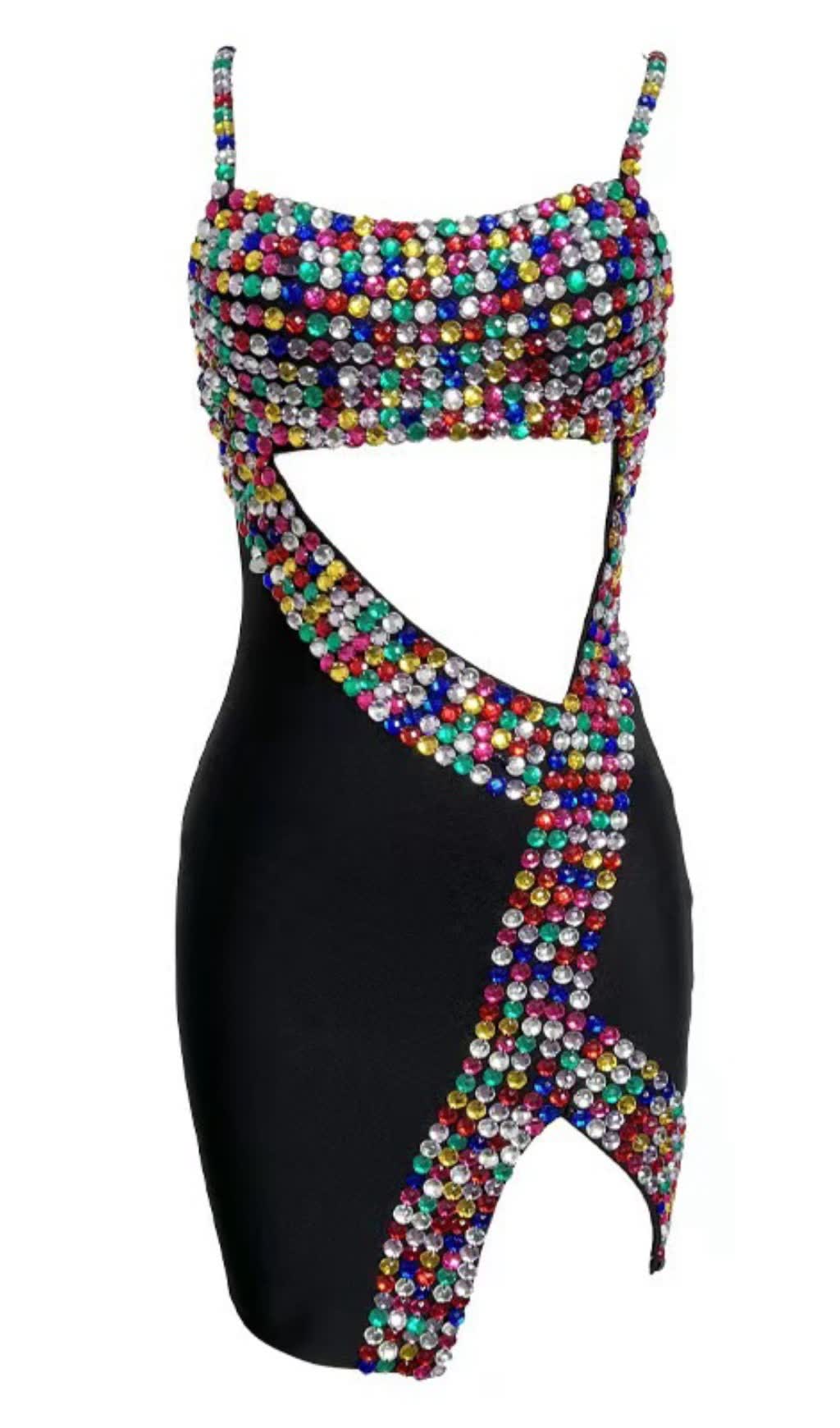 CRYSTAL EMBELLISHED CUT OUT SLIT MINI DRESS IN BLACK