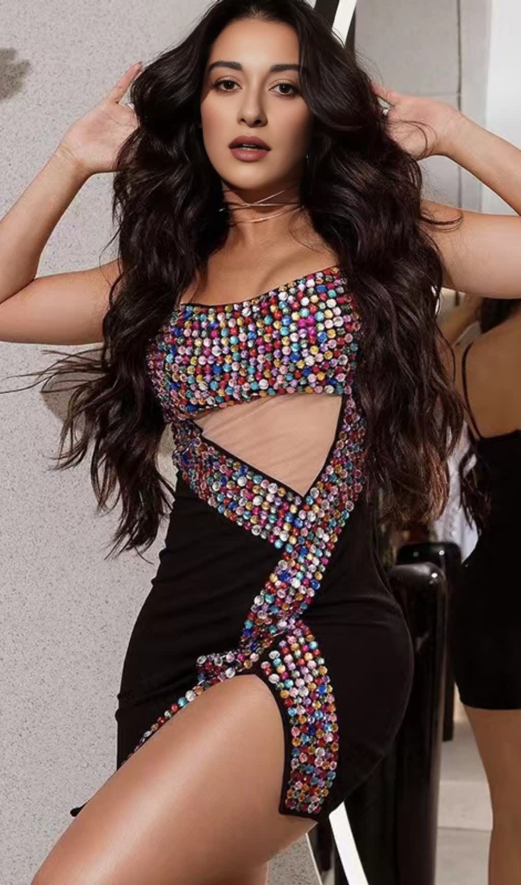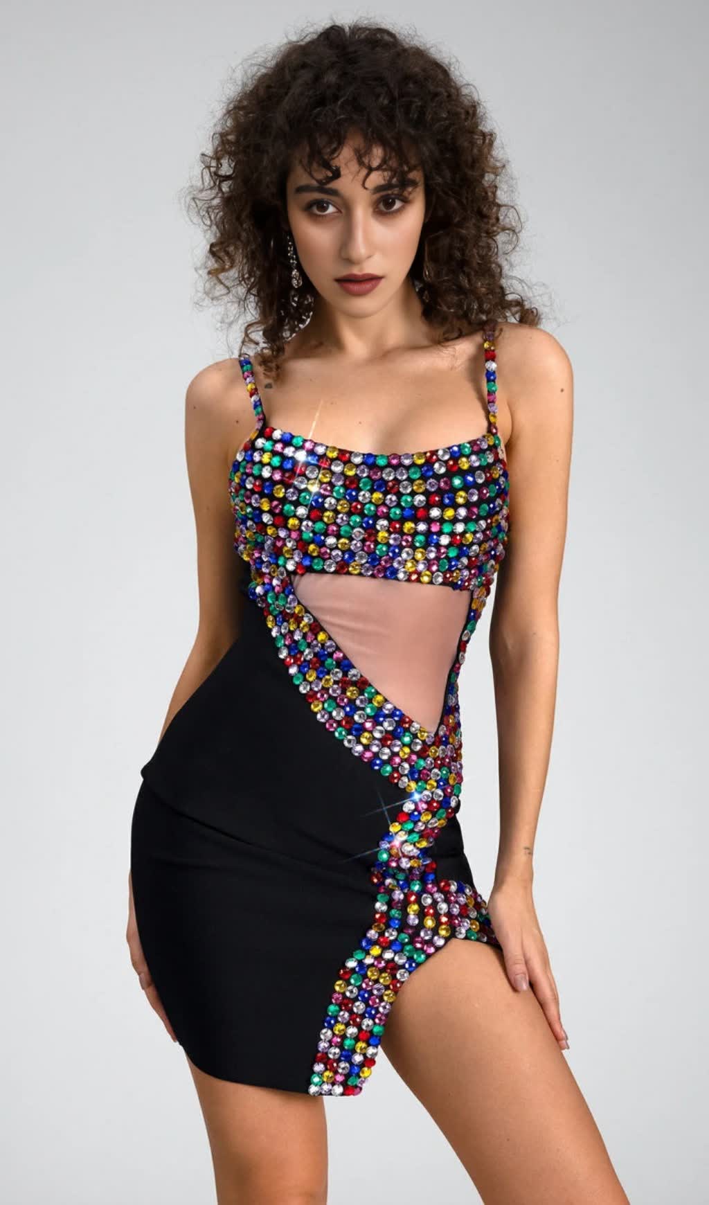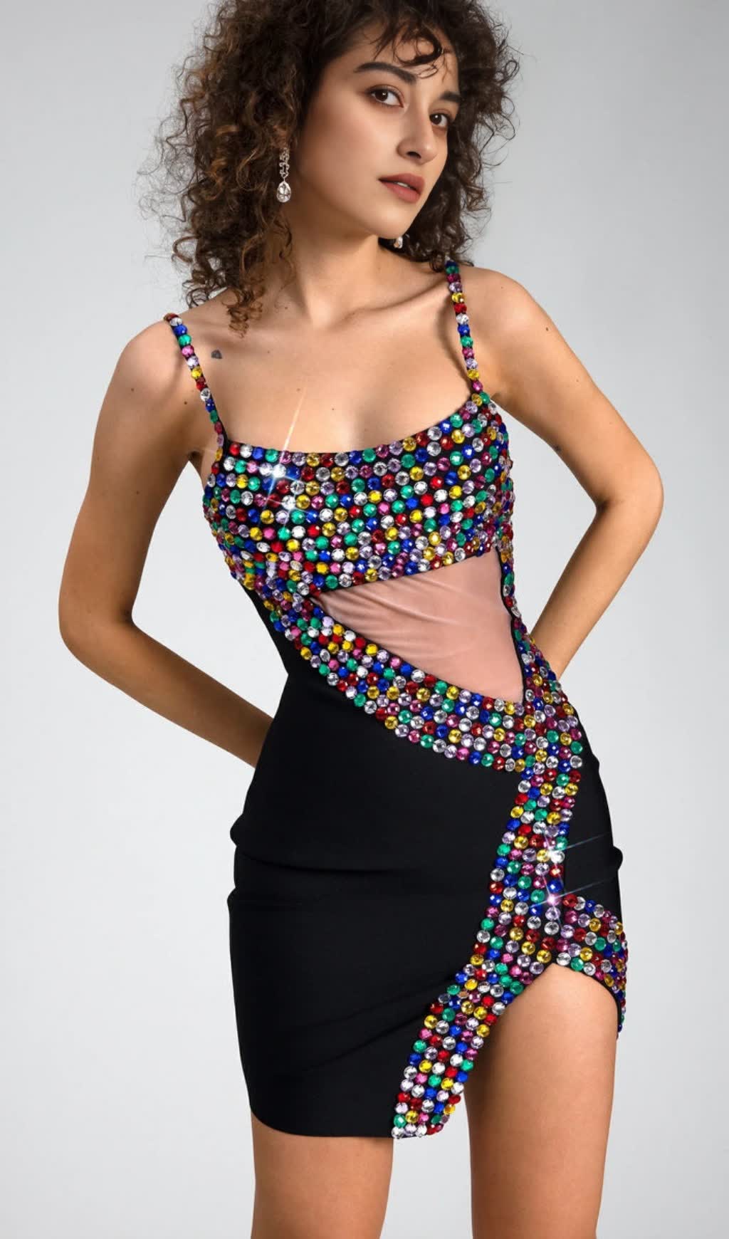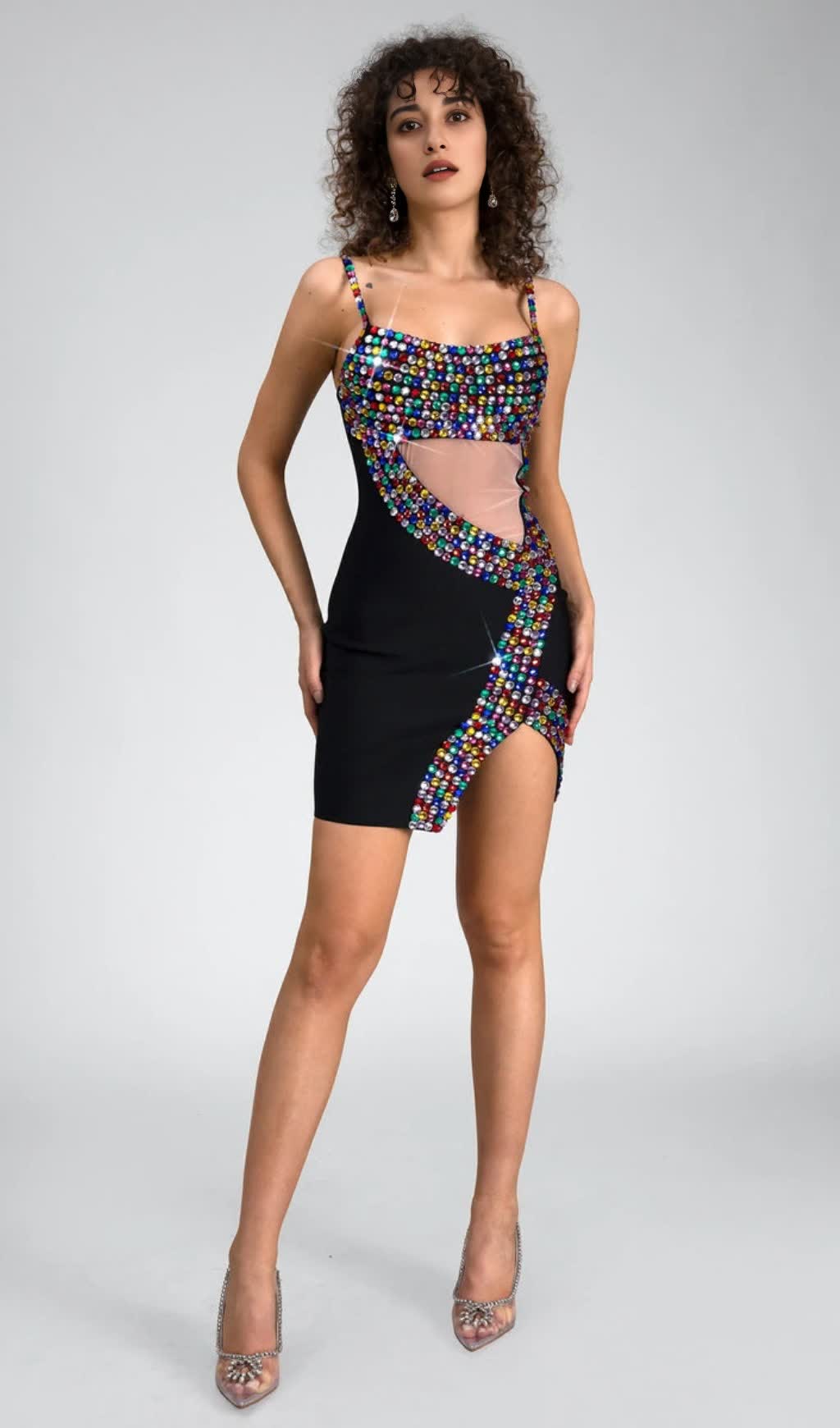 CRYSTAL EMBELLISHED CUT OUT SLIT MINI DRESS IN BLACK
