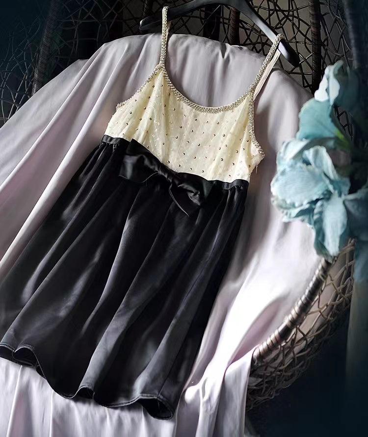 Composition: 100% silk; Trim 1: 100% plastic; Trim 2: 100% metal; Crystals: 100% glass