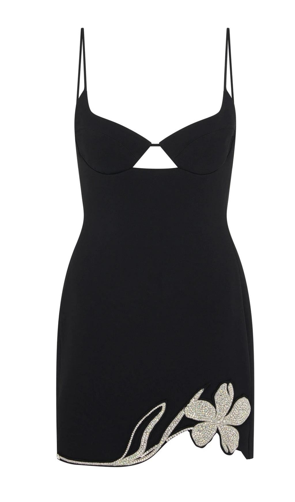 CRYSTAL FLOWER MINI DRESS IN BLACK