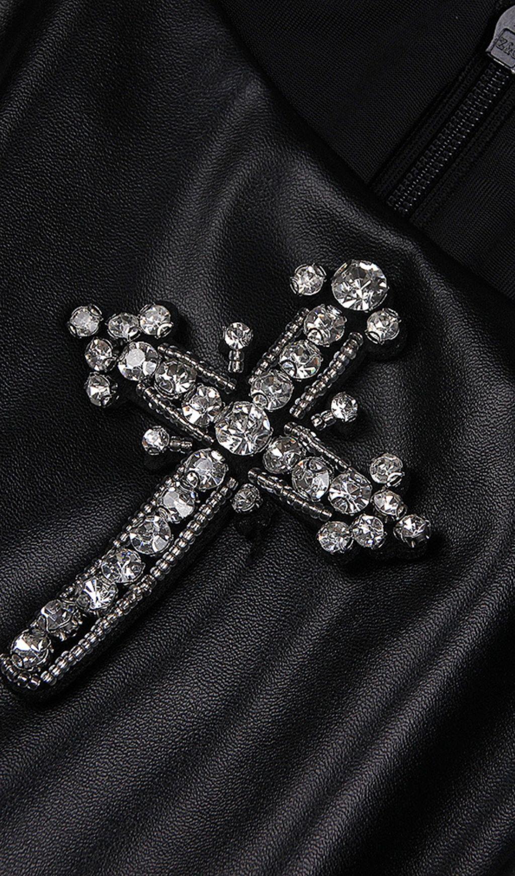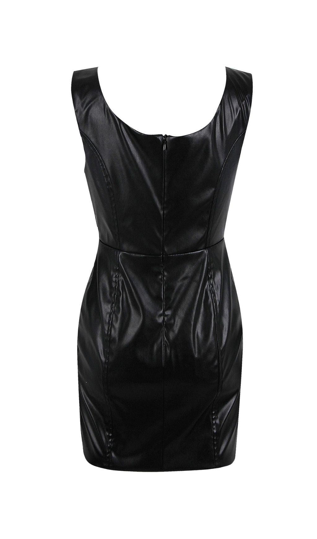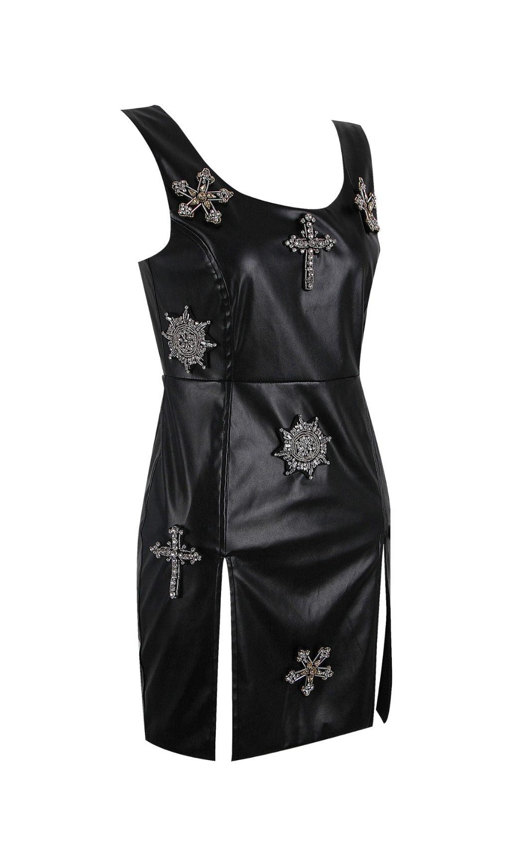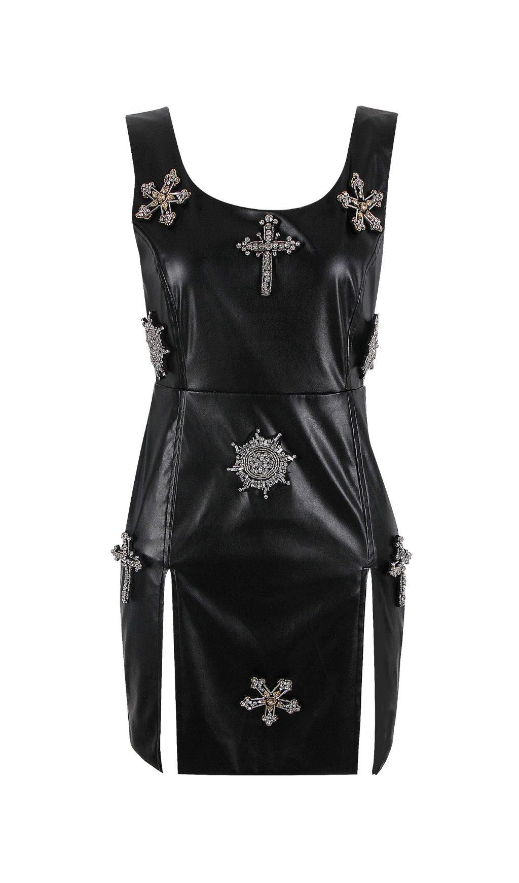 CRYSTAL LEATHER MINI DRESS IN BLACK