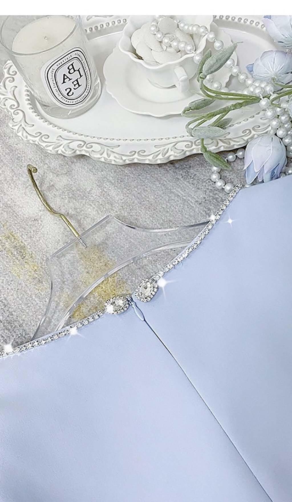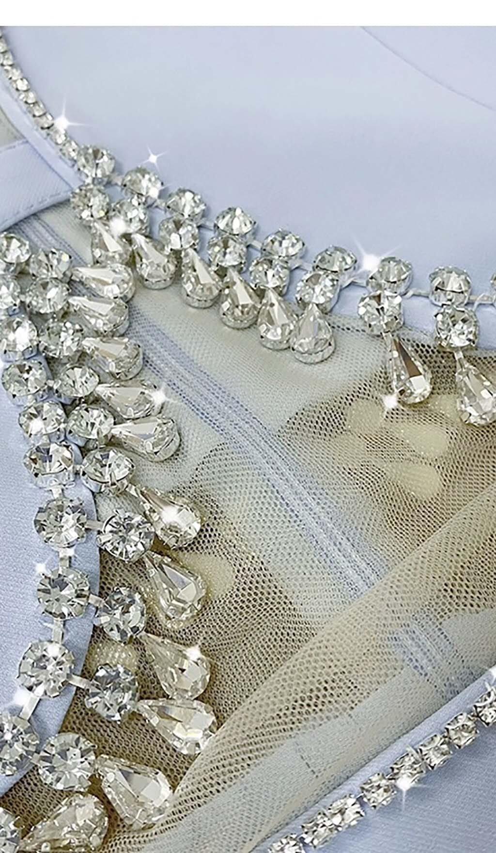 CRYSTAL TRIM CUTOUT MINI DRESS IN SKY BLUE