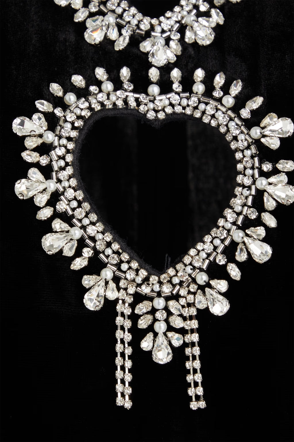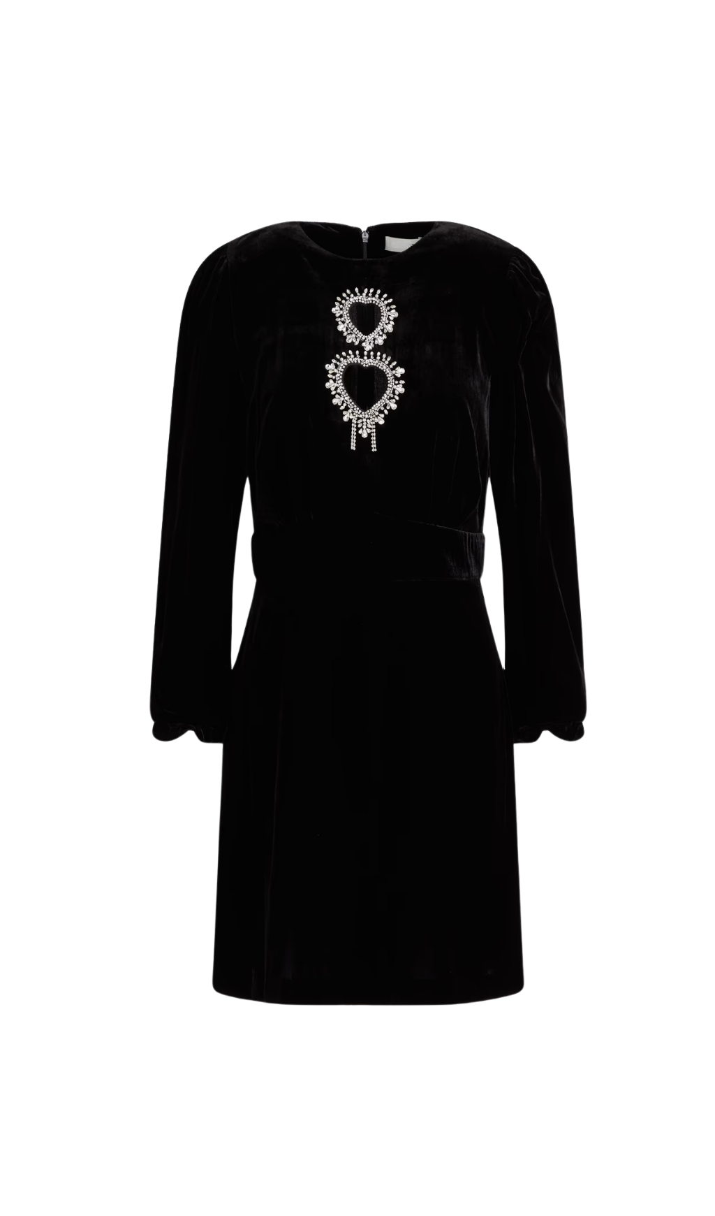 This black velvet mini dress features intricate cutouts and sparkling crystal embellishments, making it a standout piece in any wardrobe. The luxurious velvet fabric adds a touch of elegance, while the cutouts and crystals add a bold and glamorous touch. Perfect for standing out at any event or special occasion.