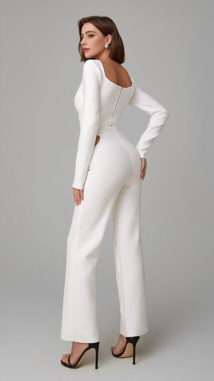 This set includes a white crop top with long sleeves, cutout details, and matching pants. The sleek, modern design is stylish. Ideal for ��holiday break dress to impress�� gatherings, as ��hoco dress inspo�� for homecoming, or a ��celebrity event dress to impress�� occasion. Its edgy, sophisticated style lets you ��dress to impress�� with confidence, perfect for formal events, parties, or special outings to stand out.
