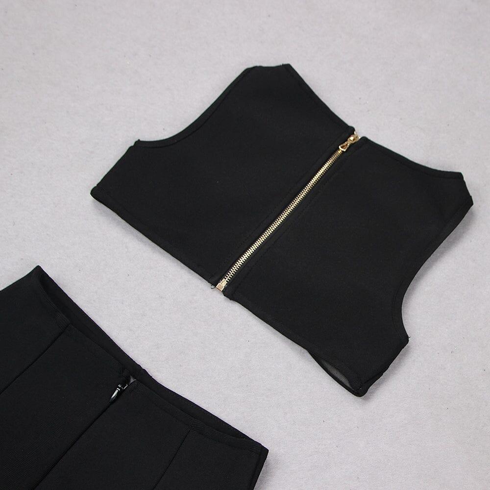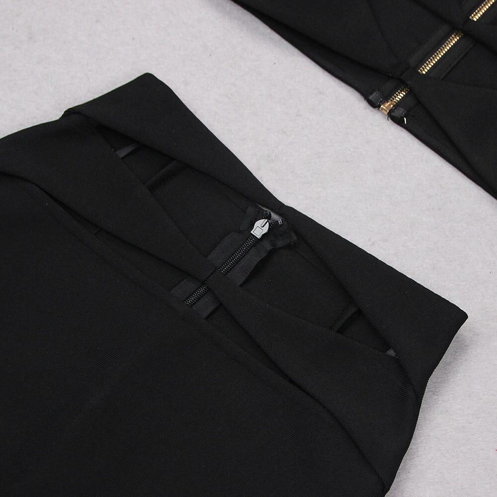 Introducing our stunning Cutout Two Piece Suit in Black, a must-have ensemble for the fashion-forward woman. This set features a crop top with a daring cutout at the front, paired with a high-waisted skirt that boasts cutout details at the sides.