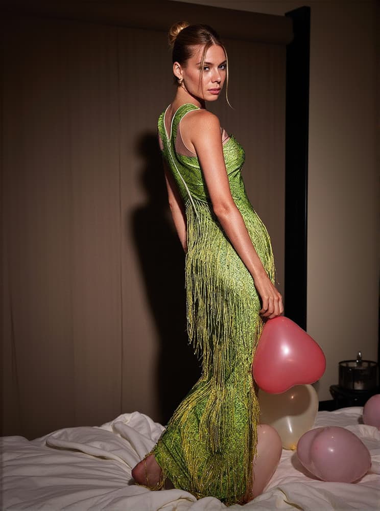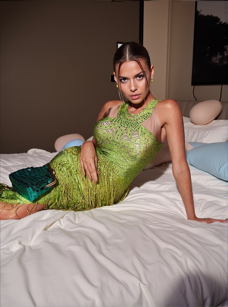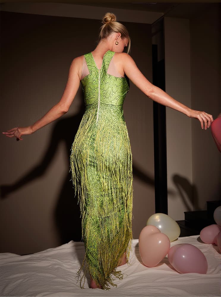 The Cyfel Floral Crystal Fringe Midi Dress In Green is the perfect way to complete your special event look. Cut from a lightweight fabric featuring a beautiful floral print and soft, crystal fringing, this timeless piece is sure to make a statement. With a versatile midi length, this dress is perfect for any occasion.