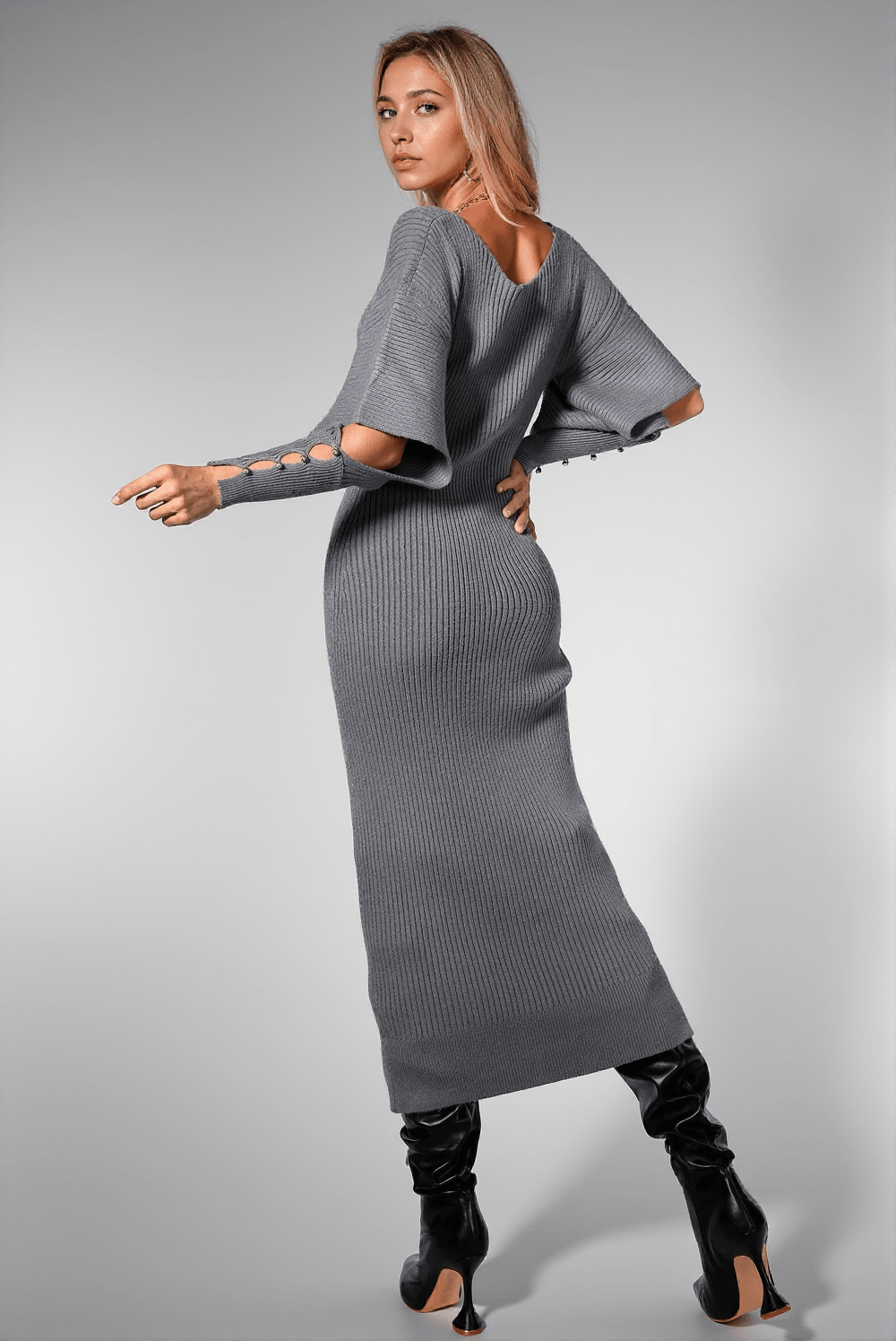 The Dajahnae Grey Knit Sweater Dress boasts a unique cutout element that adds an edgy touch to its classic design, perfect for those looking to make a statement. This dress is versatile enough to be dressed up or down.