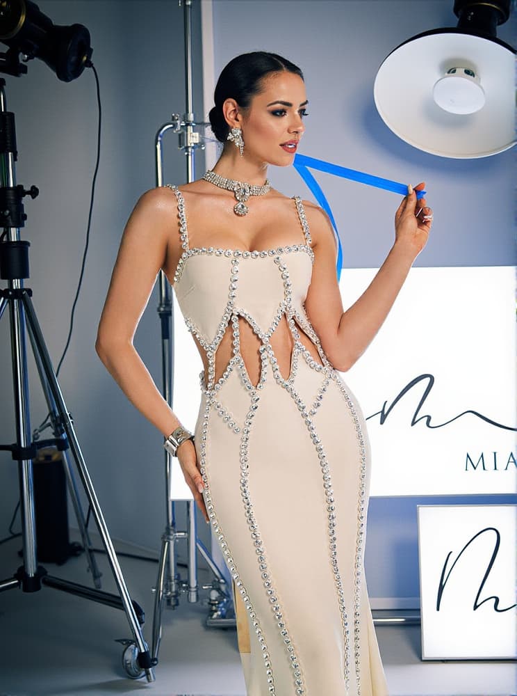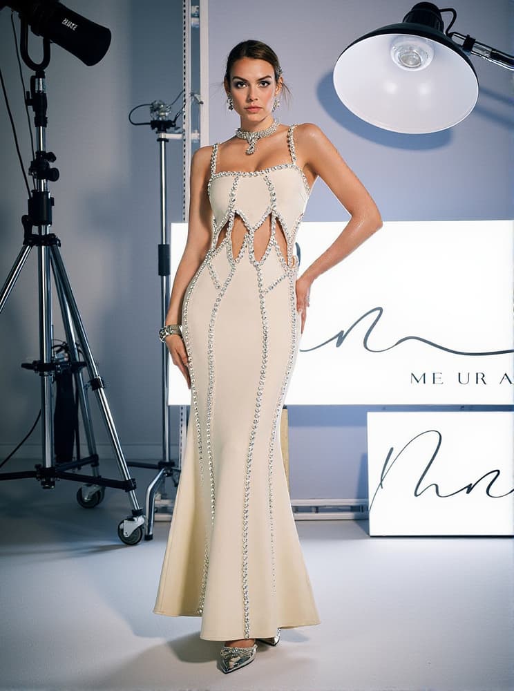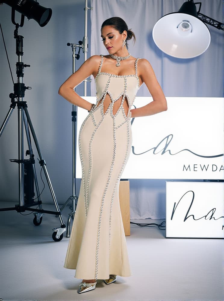 Elevate your style game with the stunning Dario Spaghetti Crystal Cutout Bandage Dress. This dress features a unique cutout design and sparkling crystal accents, perfect for adding a touch of glamour to any occasion. Its form-fitting bandage fabric will hug your curves and accentuate your figure, making you feel confident and beautiful. Elevate your wardrobe with this must-have dress!