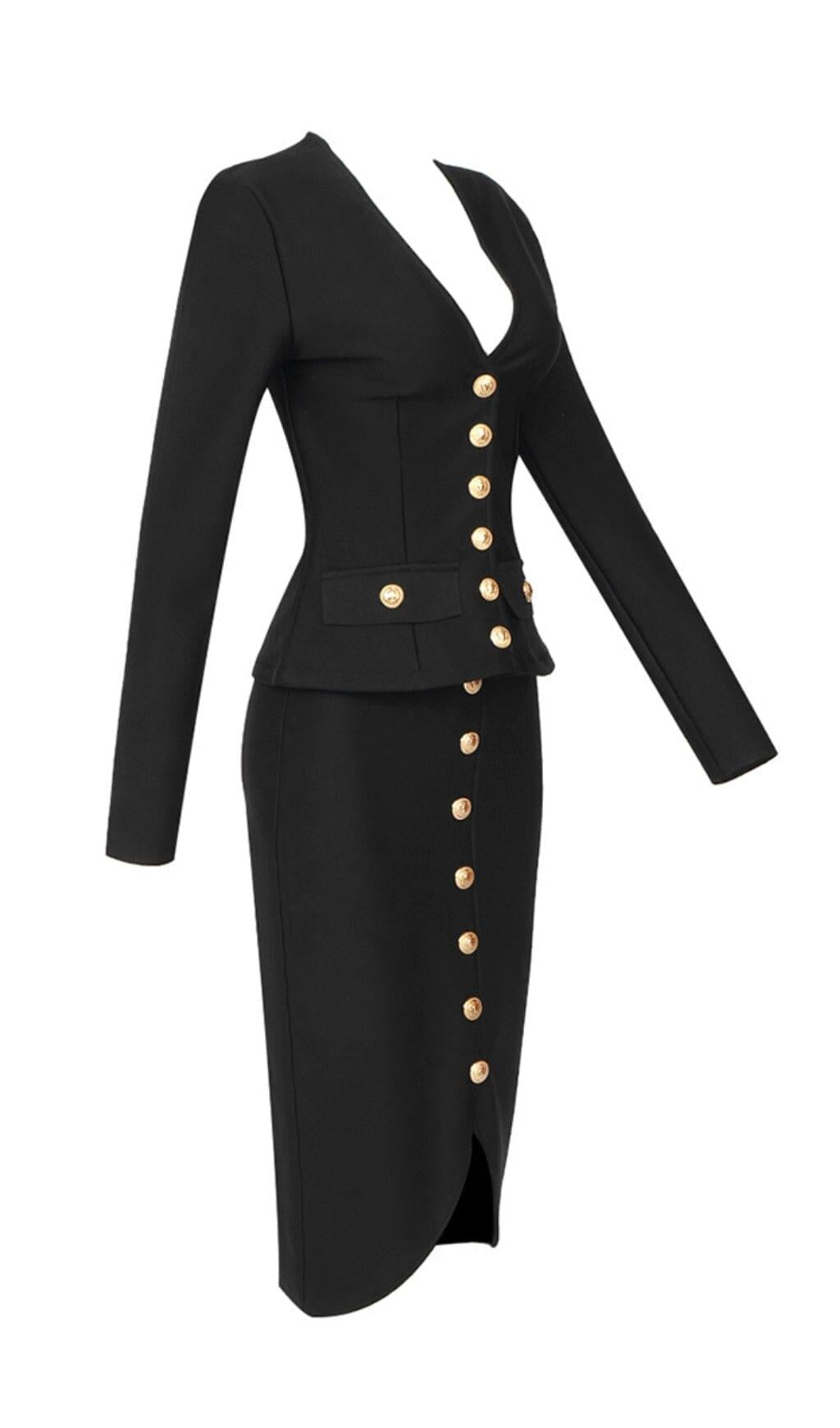 V-NECK METAL BUTTON DECORATIVE SLIM FIT SKIRT IN BLACK