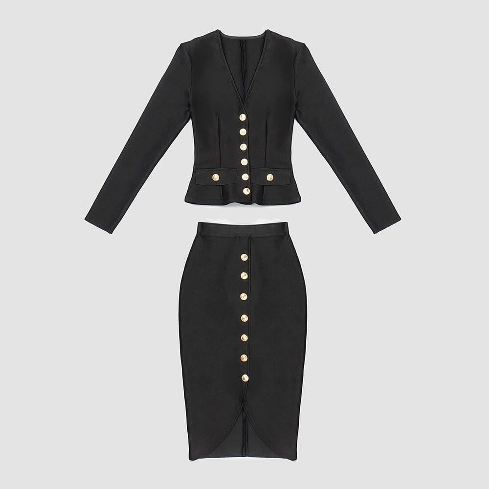 Introducing the V-Neck Metal Button Decorative Slim Fit Skirt in Black