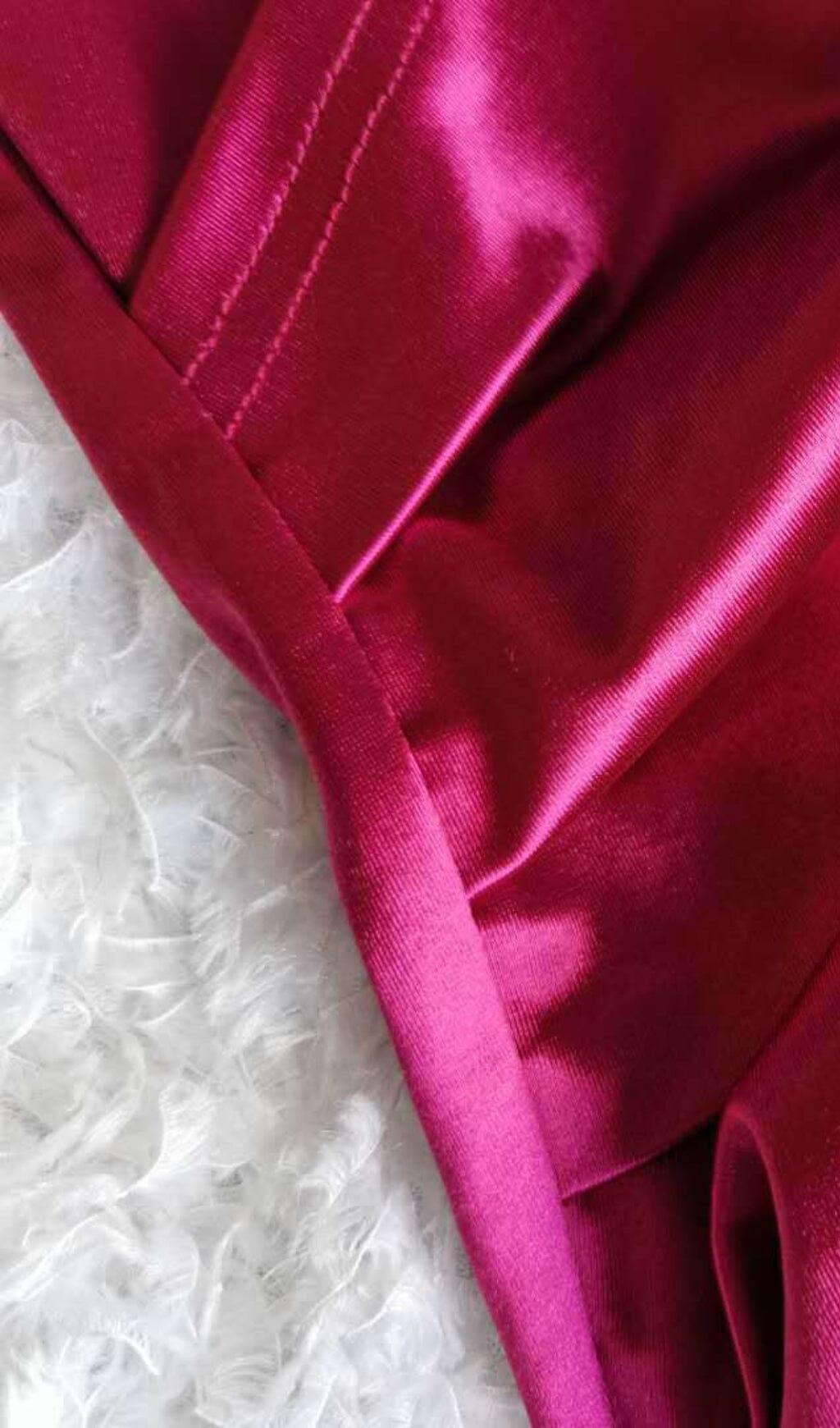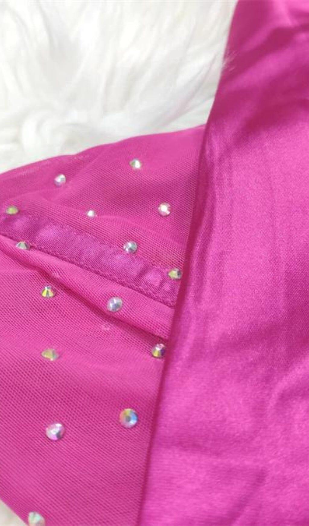 Elevate your style with the DARLENE FUCHSIA OFF SHOULDER CORSET SATIN DRESS WITH CRYSTALS. This stunning dress is perfect for special occasions and will make you stand out from the crowd.