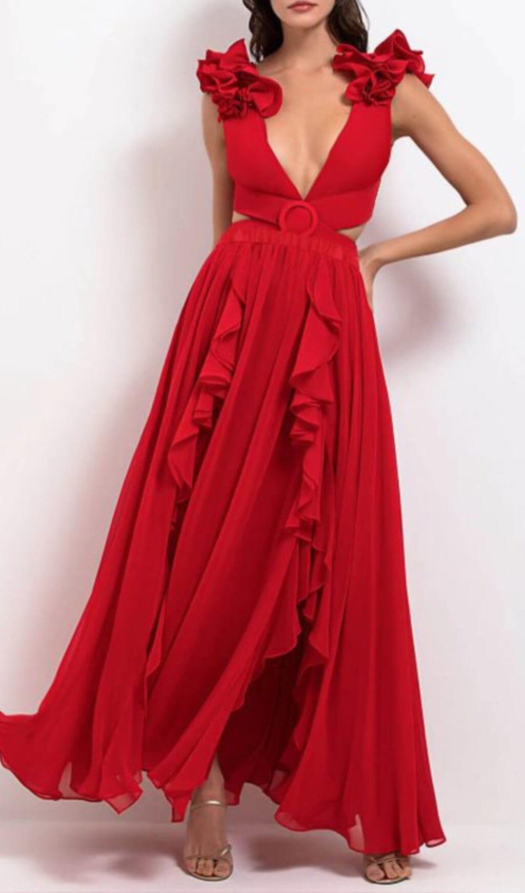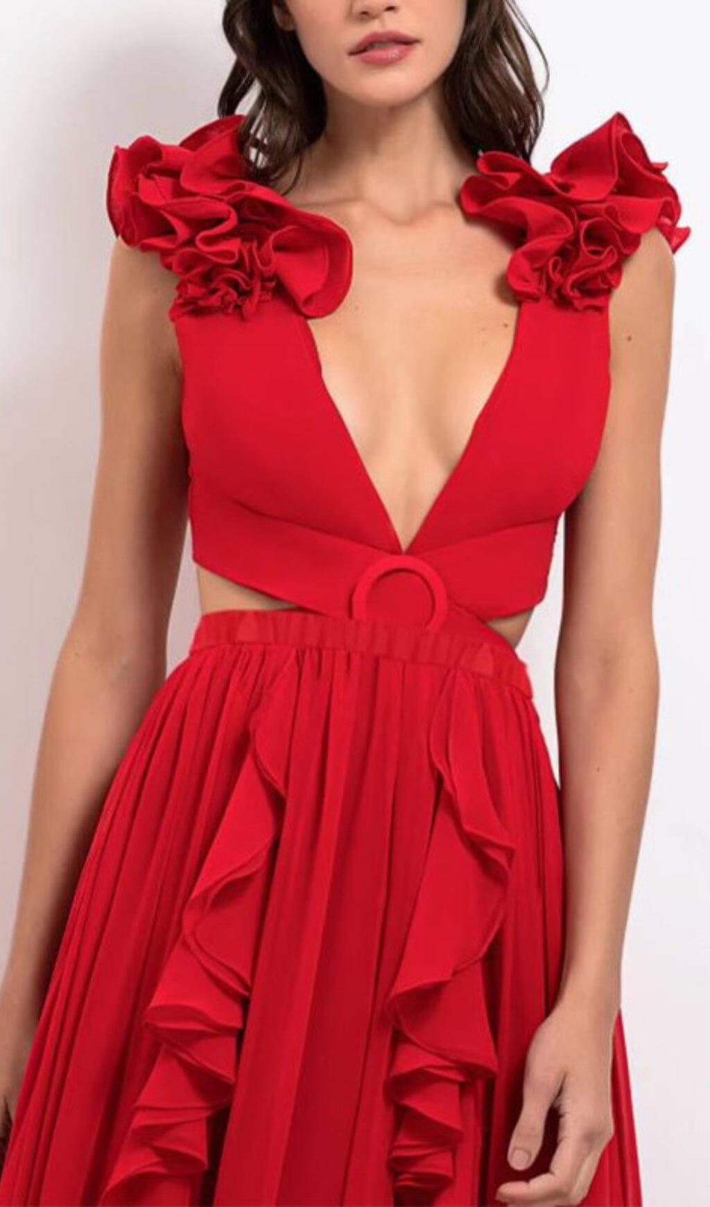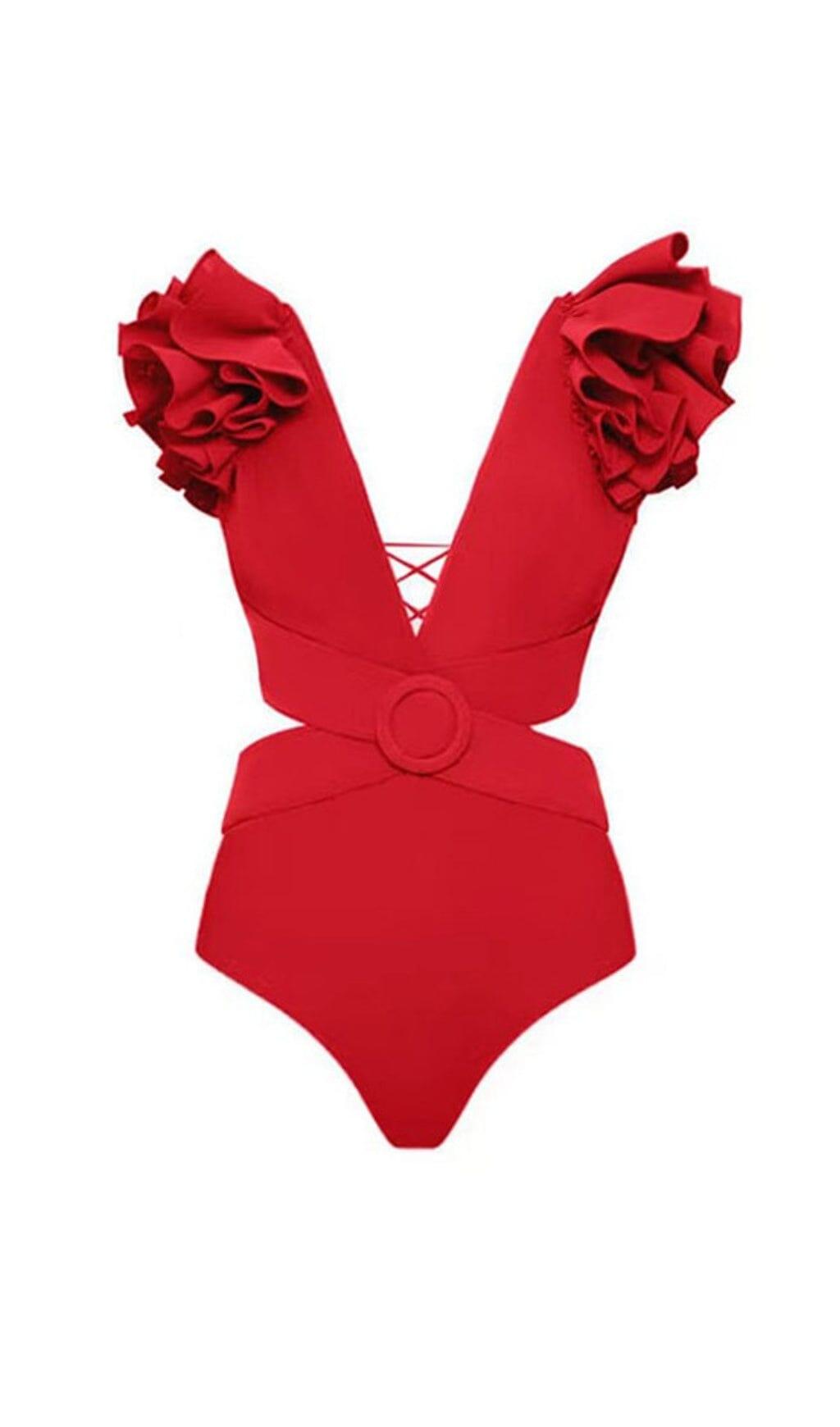 DEEP V RED CUTOUT ONE PIECE SWIMSUIT AND SKIRT