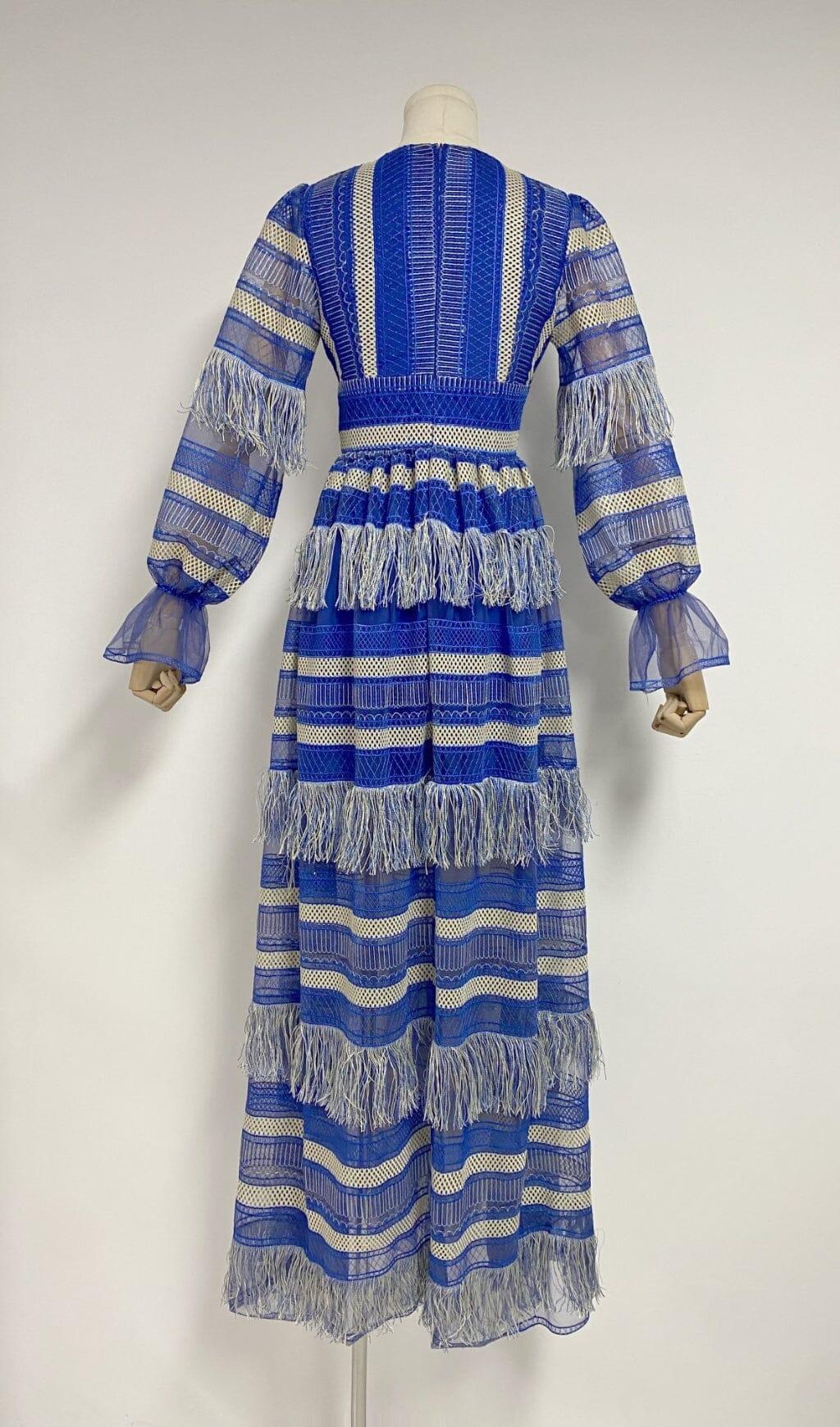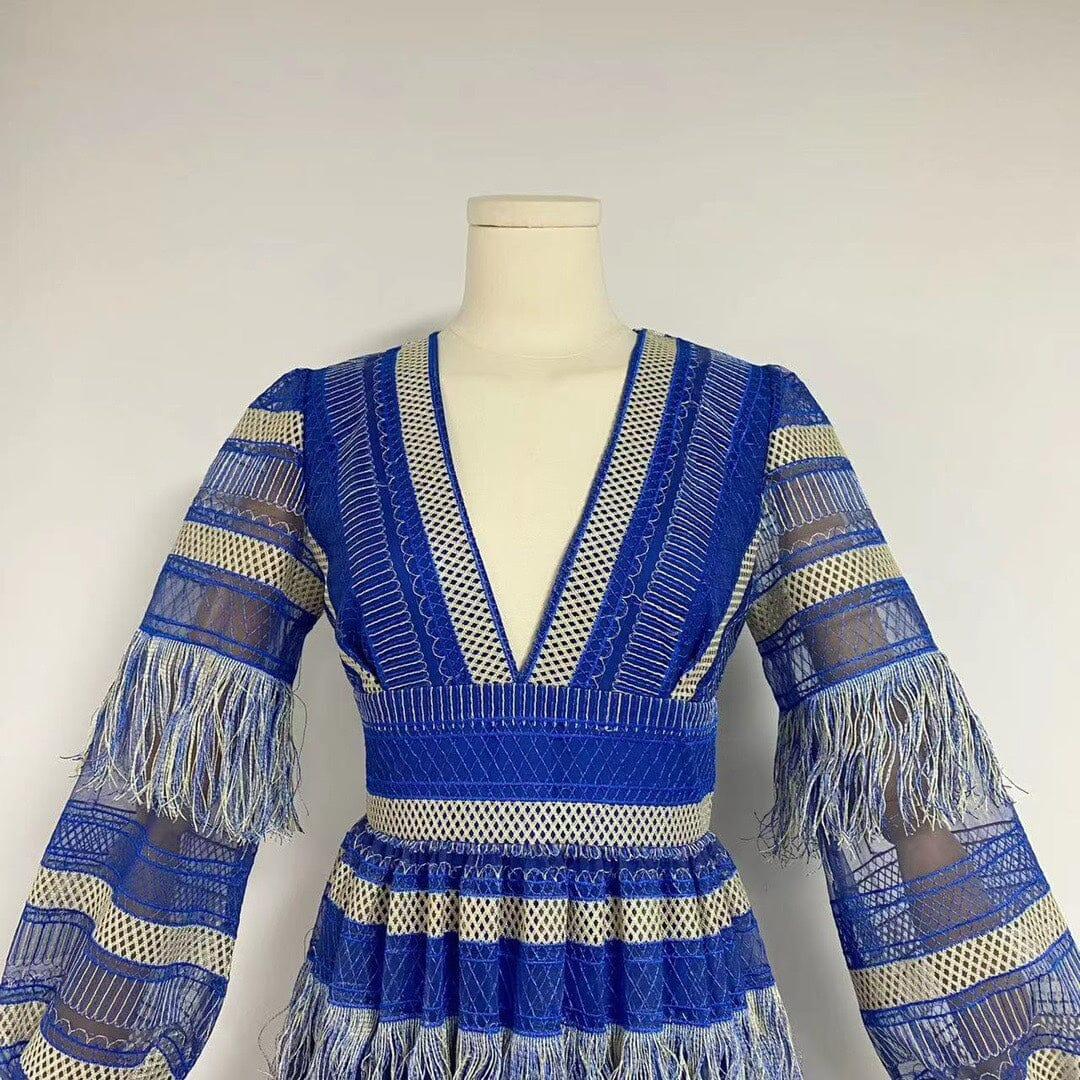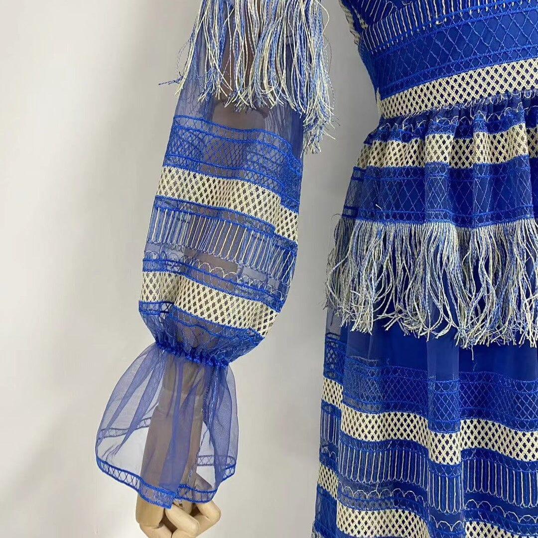 Don't miss out on this must-have dress. Add a touch of elegance to your wardrobe with the DEEP V TASSEL BLOUSON SLEEVES MAXI DRESS IN BLUE.