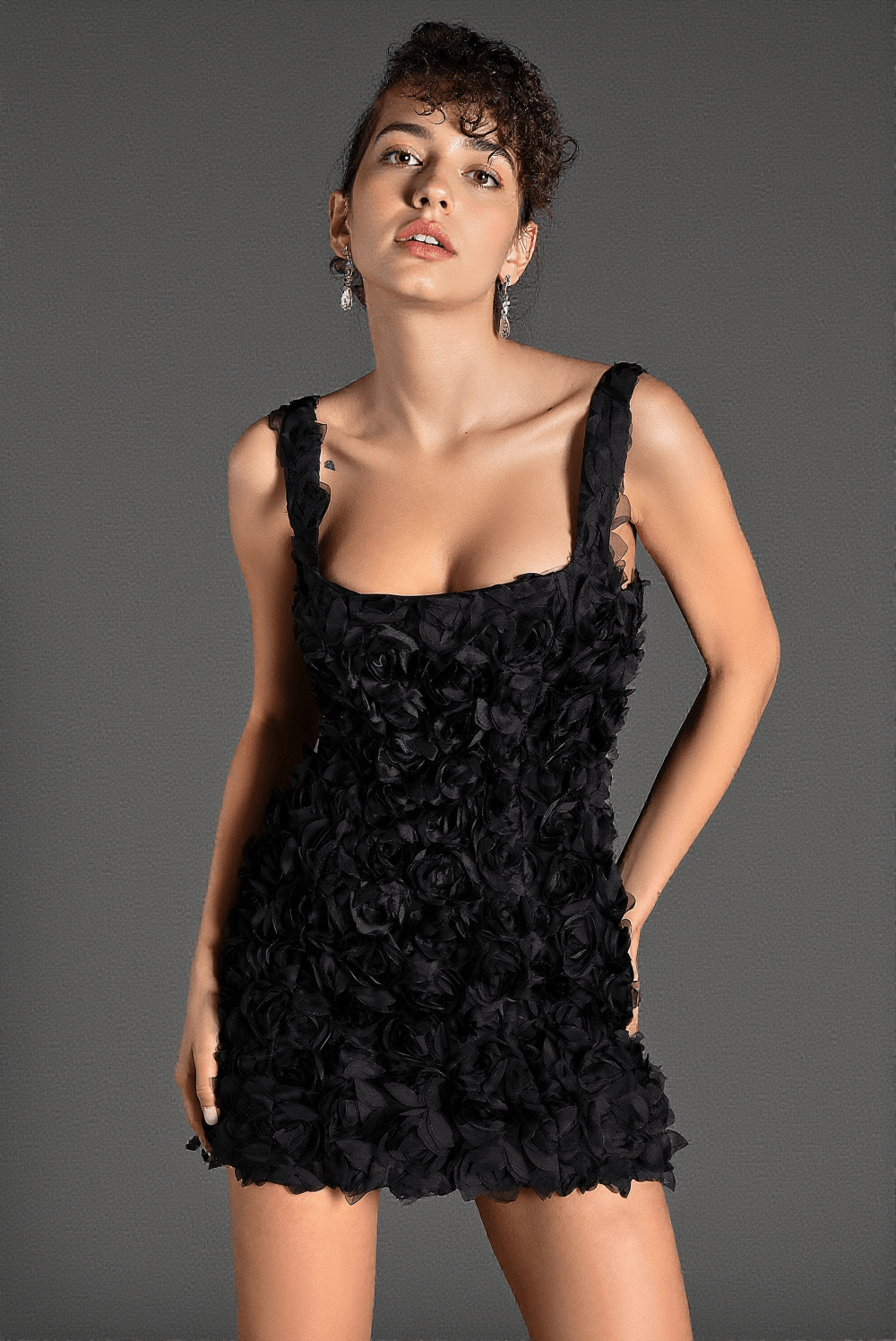 The Dellidi 3D Floral Mini Dress in black is a whimsical masterpiece, exquisitely designed to captivate your senses with its intricate detailing and romantic flair. This dress effortlessly combines boldness and sophistication, making it the perfect choice for any special occasion.
