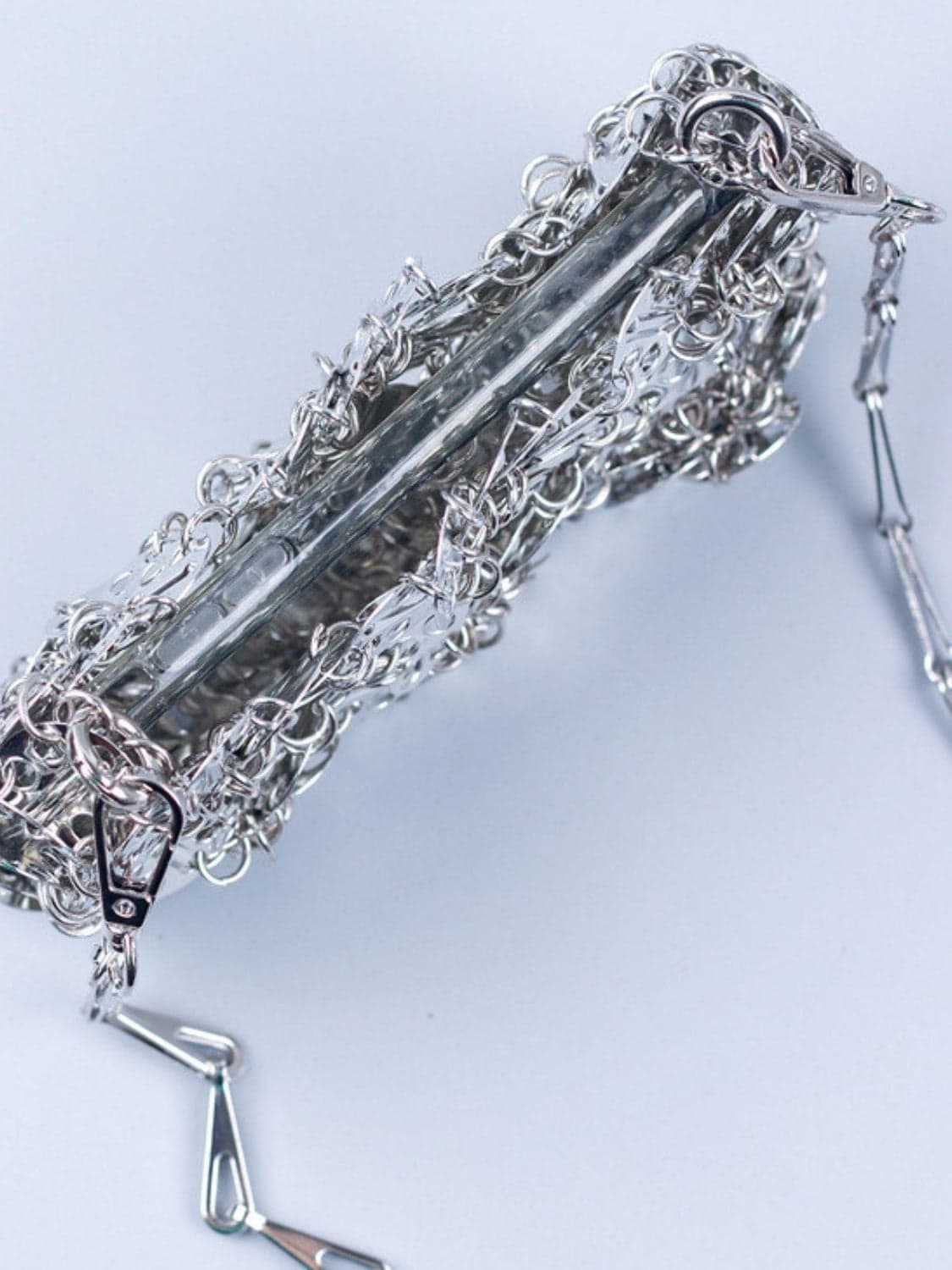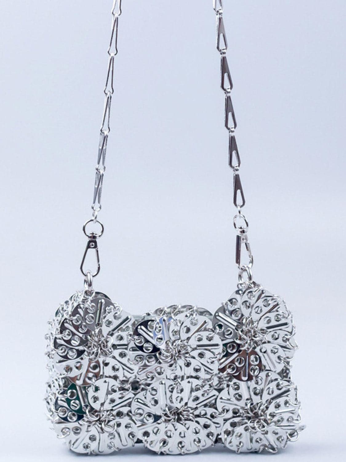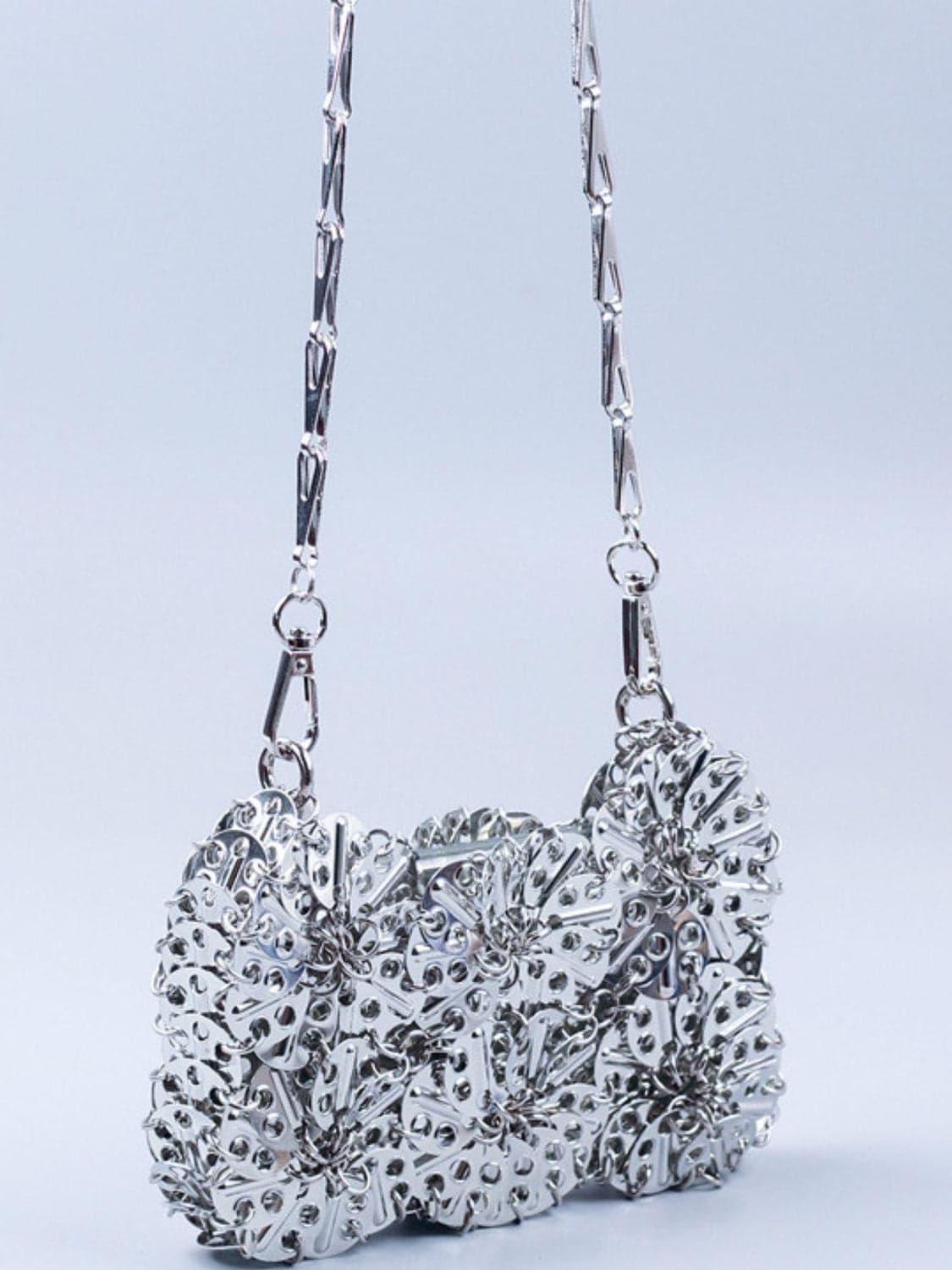 This silver floral chainmail bag is perfect for the risk-taker. Crafted with strong links that will never break, it's a fashionable and daring accessory to enhance any outfit. Take a stylish risk and flaunt this one-of-a-kind bag!