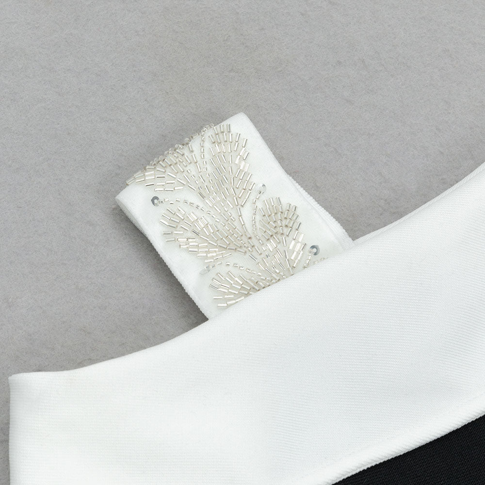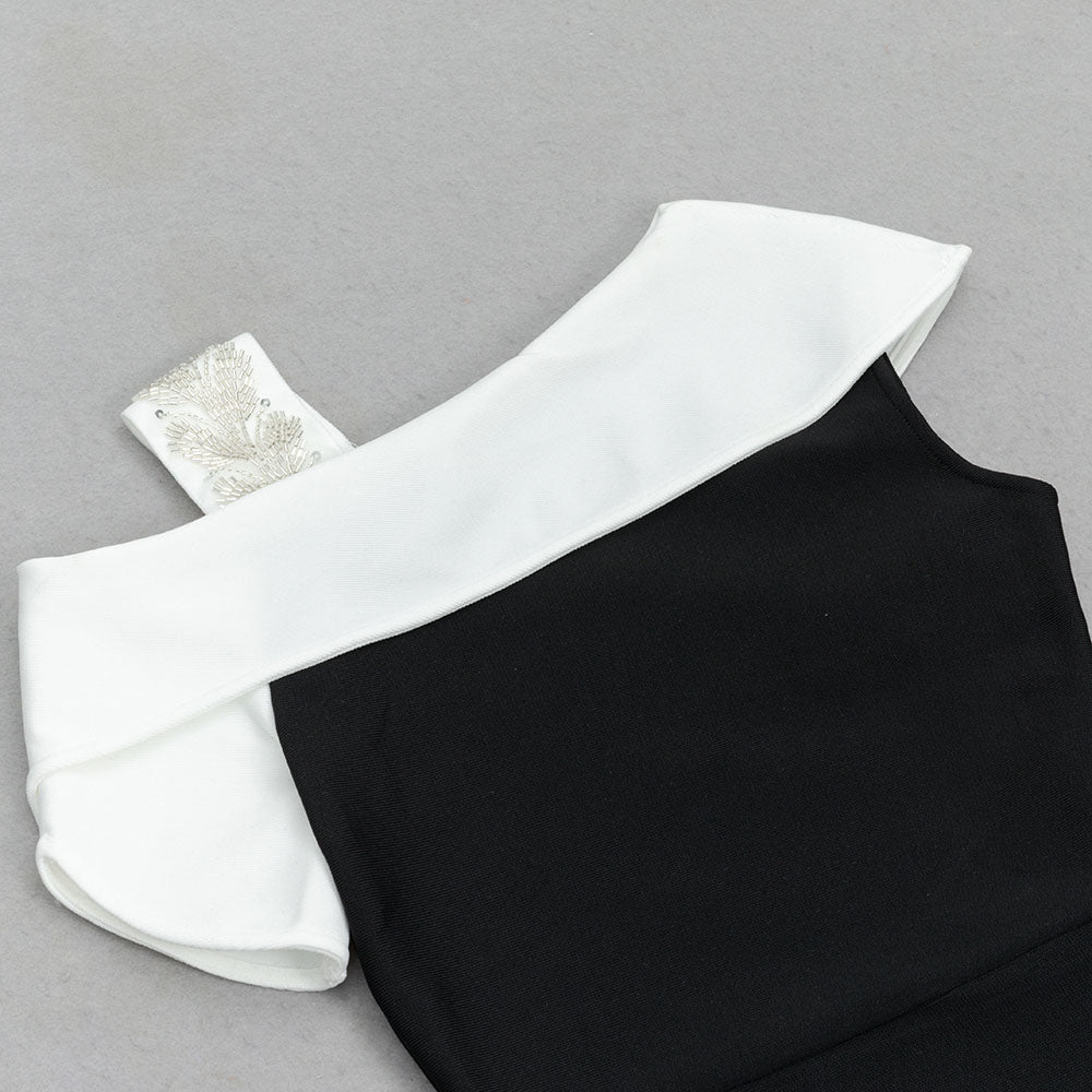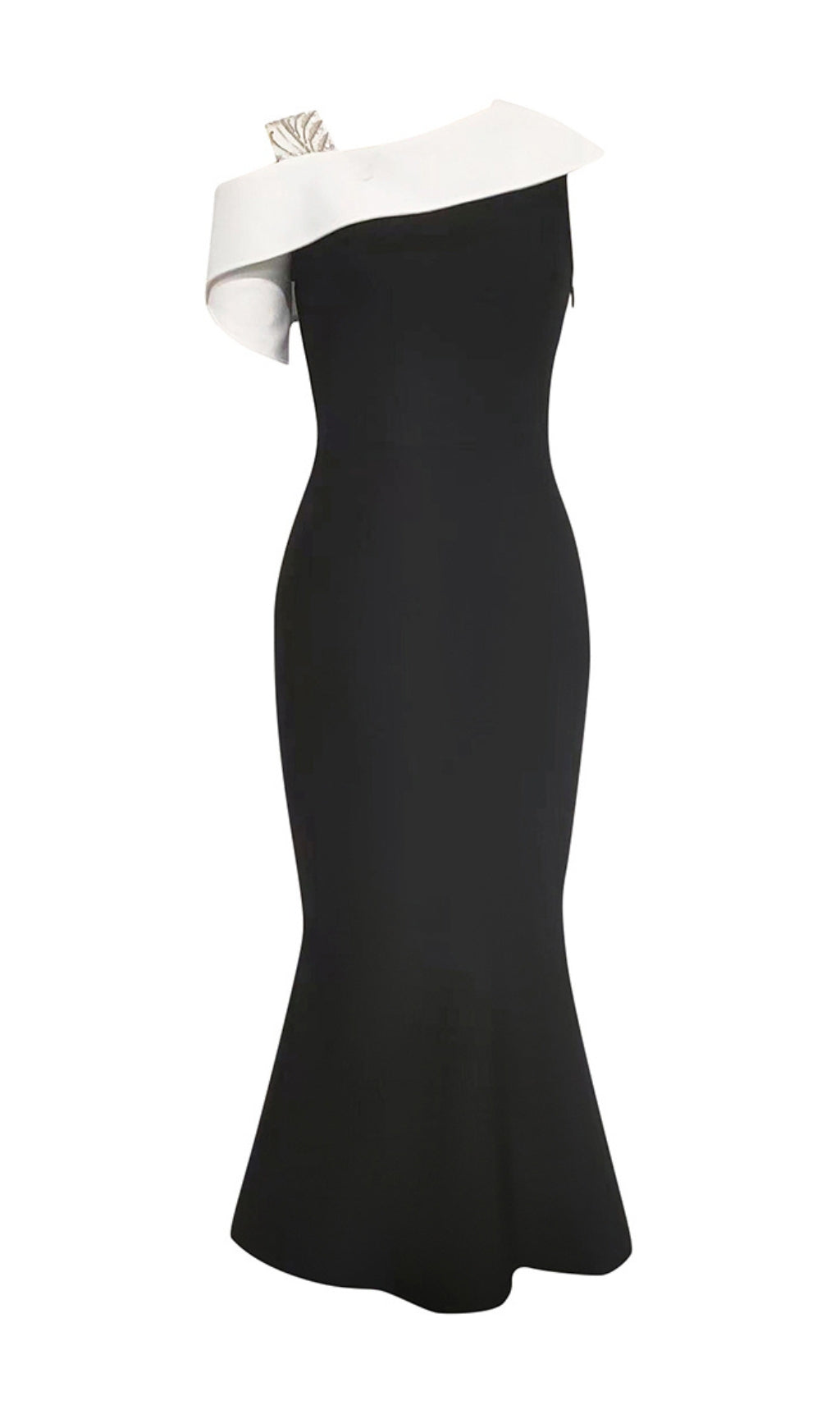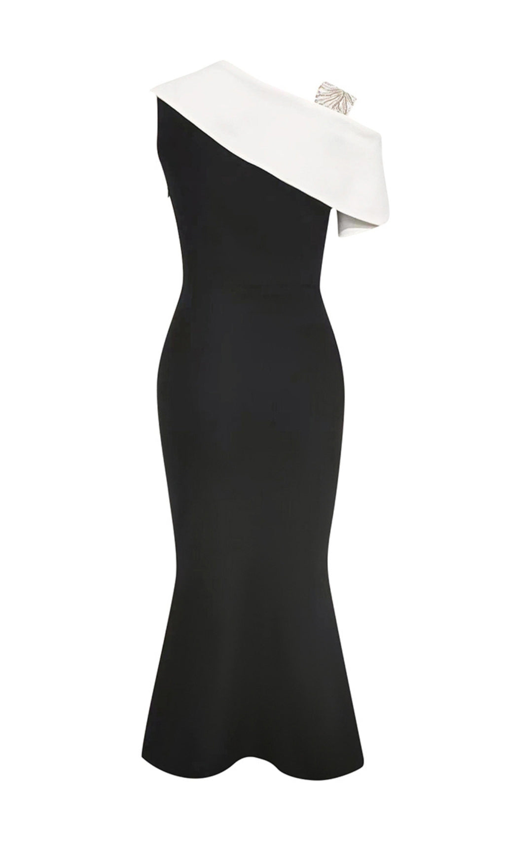Its unique diagonal design and dramatic fishtail cut offer a daring twist to the classic midi dress. Perfect for the risk-takers who want to make a statement at any event.