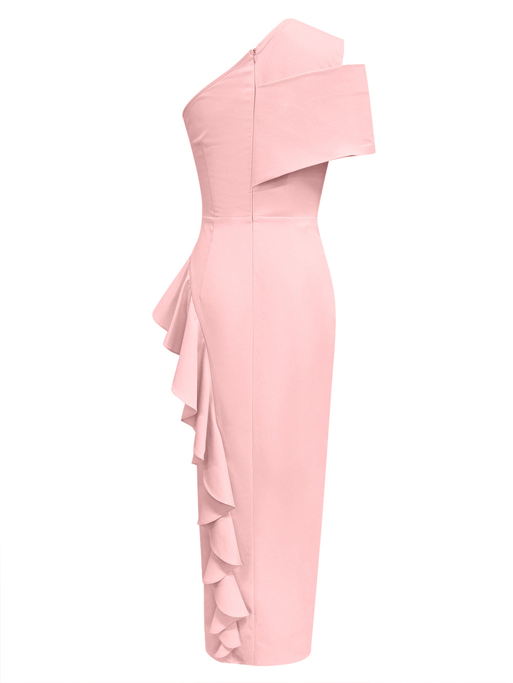DIAGONAL SHOULDER PLEATED SLIT RUFFLED DRESS IN PINK