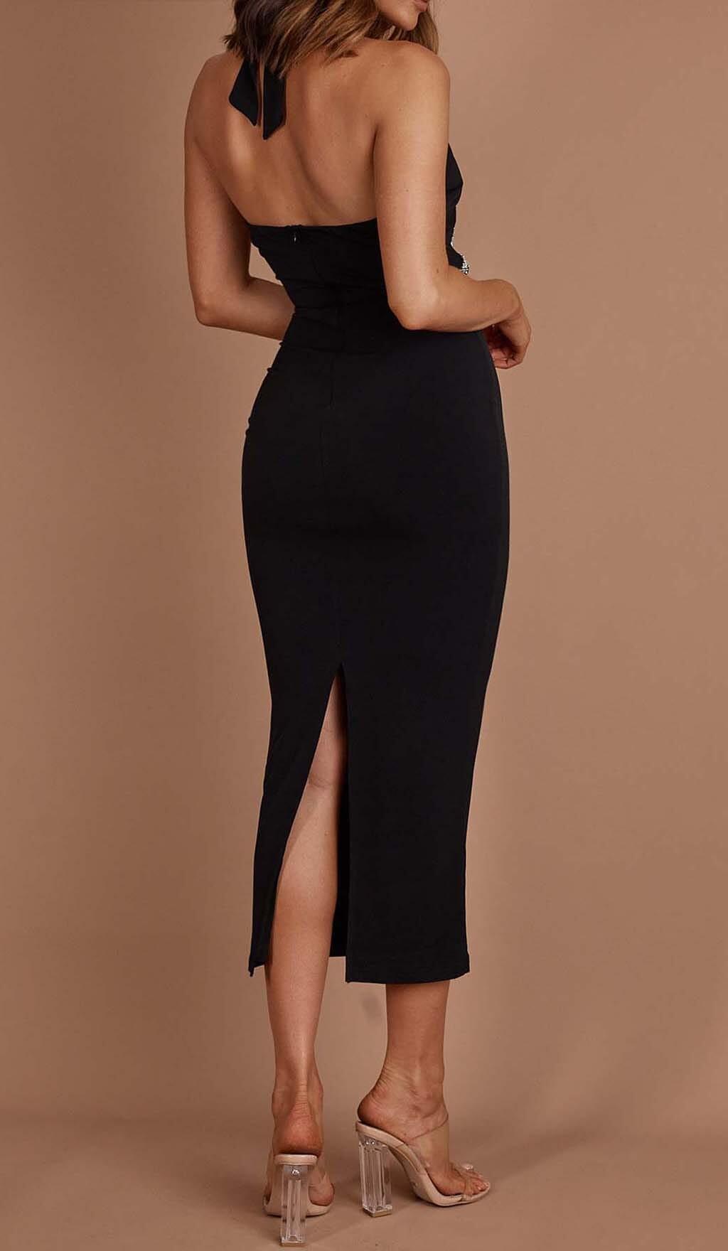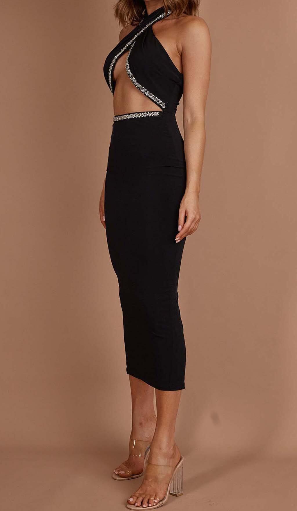 DIAMANTE TRIM MIDI DRESS IN BLACK
