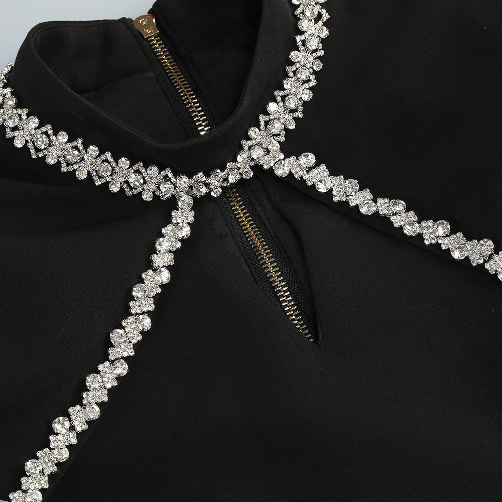 diamond chain embellished trumpet sleeve mini dress in black