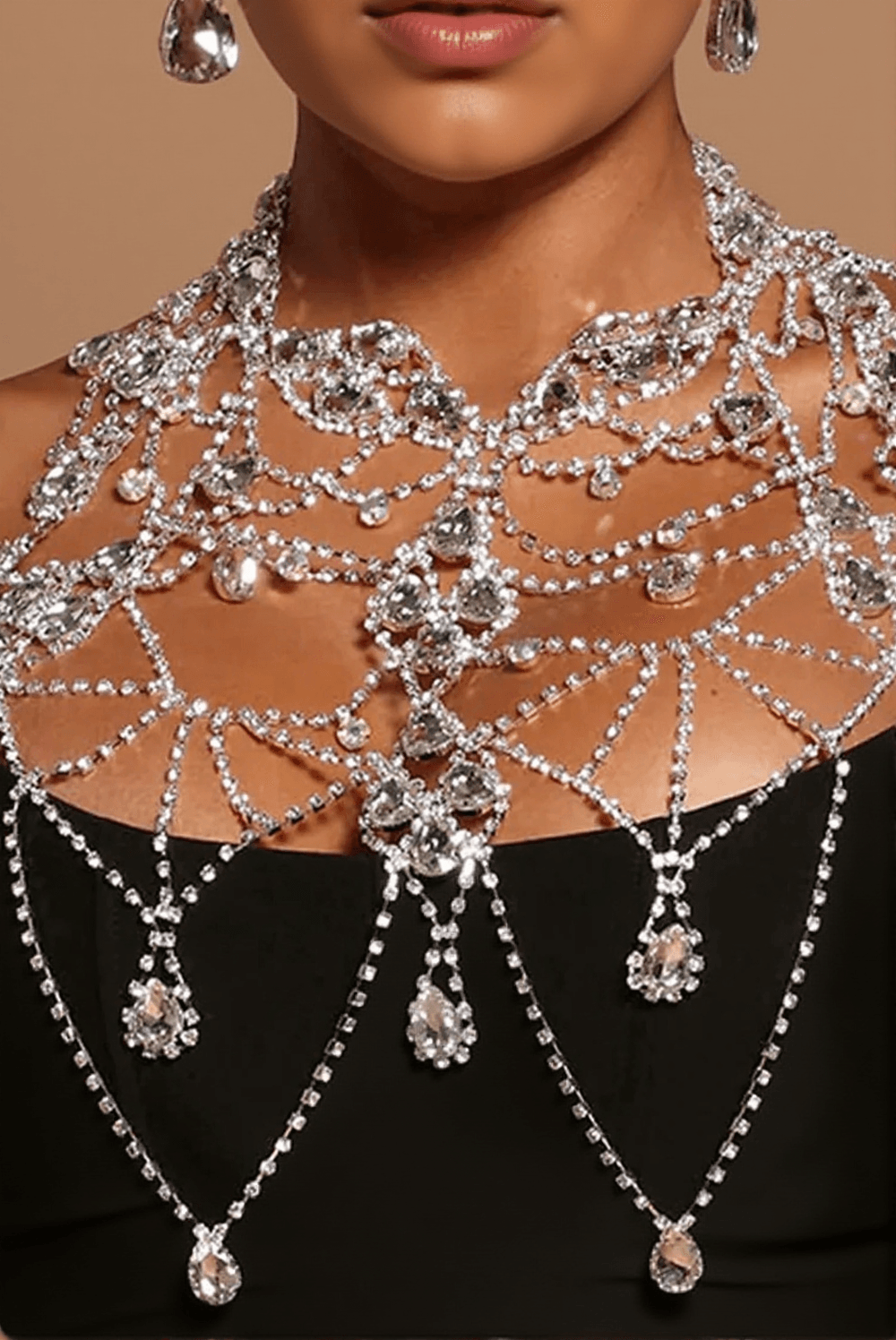 Enhancing the overall beauty of the chest chain are meticulously placed crystals that add an extra layer of shimmer and sparkle to your outfit. The interplay between the diamonds and crystals creates a mesmerizing visual effect that is sure to turn heads.