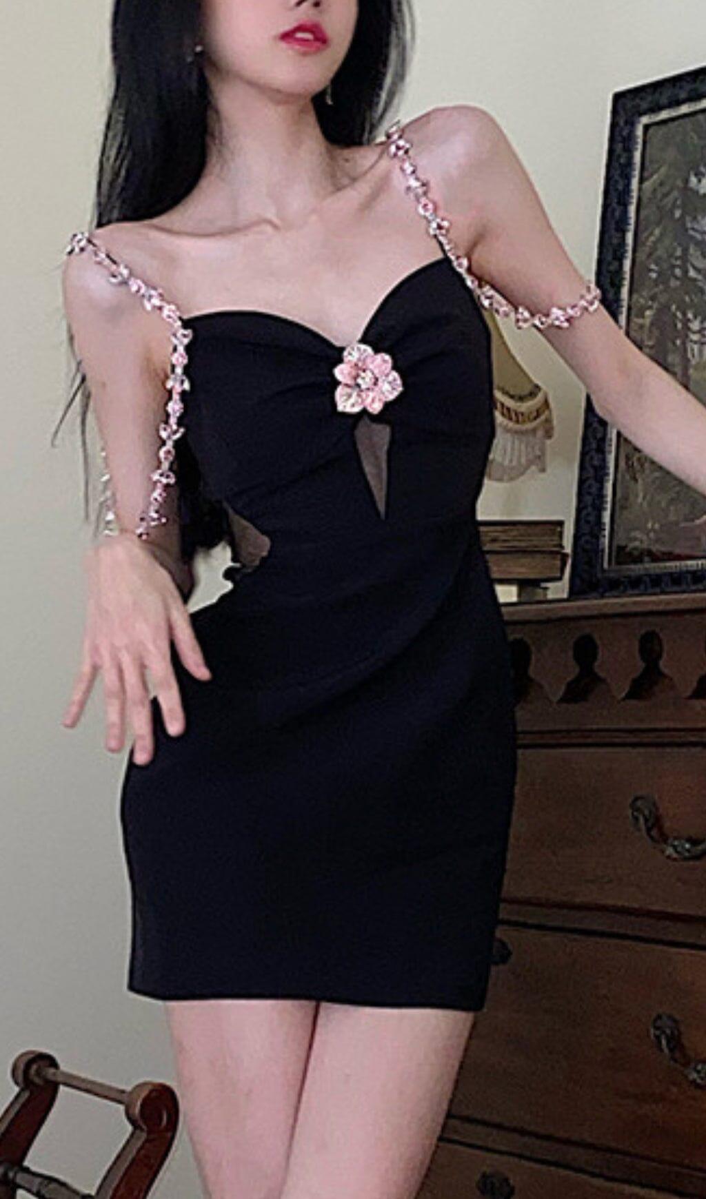 DIAMOND FLOWER SLEEVELESS SUSPENDER MINI DRESS IN BLACK